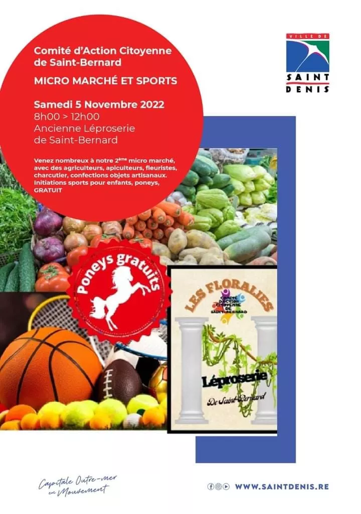 Actualités/Collectivités/Saint-Denis St-Bernard : un micro marché et sports ce samedi 05 novembre par La Rédaction 4 novembre 2022 1 min de lecture Ce samedi 05 novembre, un micro marché et sports se tiendra à l’ancienne Léproserie de St-Bernard. Au programme en entres, un marché de producteurs et des animations gratuites pour les enfants. Ne manquez pas toute l’actualité de La Réunion ! Abonnez-vous à la newsletter de Free Dom ! Valider Partager Facebook Twitter Pinterest Linkedin Whatsapp Reddit Email Catégorie: marché Vous pourriez être intéressé par 31 décembre 2025 Mercredi 31 décembre 2025 – Météo, éphéméride et horoscope du jour 30 décembre 2025 Mardi 30 décembre 2025 – Météo, éphéméride et horoscope du jour 29 décembre 2025 Saint-Joseph : découverte de 2337 plants de cannabis, arrestation de 2 individus La Rédaction Laisser un commentaire Annuler la réponseYour email address will not be published. Enregistrer mon nom, mon e-mail et mon site dans le navigateur pour mon prochain commentaire. Current ye@r * Leave this field empty Article précédent Le Port : élection du Maire enfant et des présidents de commissions Article suivant Le Département soutient la CER-BTP : des matériaux à bas prix en un clic Articles récents... Mercredi 31 décembre 2025 – Météo, éphéméride et horoscope du jour Hommage à Johnny Hallyday sur Free Dom 2 ce 5 décembre Mardi 30 décembre 2025 – Météo, éphéméride et horoscope du jour Saint-Joseph : découverte de 2337 plants de cannabis, arrestation de 2 individus Point sur le réseau routier départemental, 29 décembre à 16H30 Suicide sur le pont de la Rivière d’Abord : importante mobilisation des secours et des forces de l’ordre Radier submergé à Ilet Furcy : la route de Cilaos fermée à la circulation cette nuit Fortes pluies : appel à la plus grande prudence à Saint-Paul Saint-Gilles-les-Bains : une route impraticable, les riverains montent au créneau (VIDEOS) Très grands excès de vitesse : un délit passible de prison depuis le 29 décembre 2025