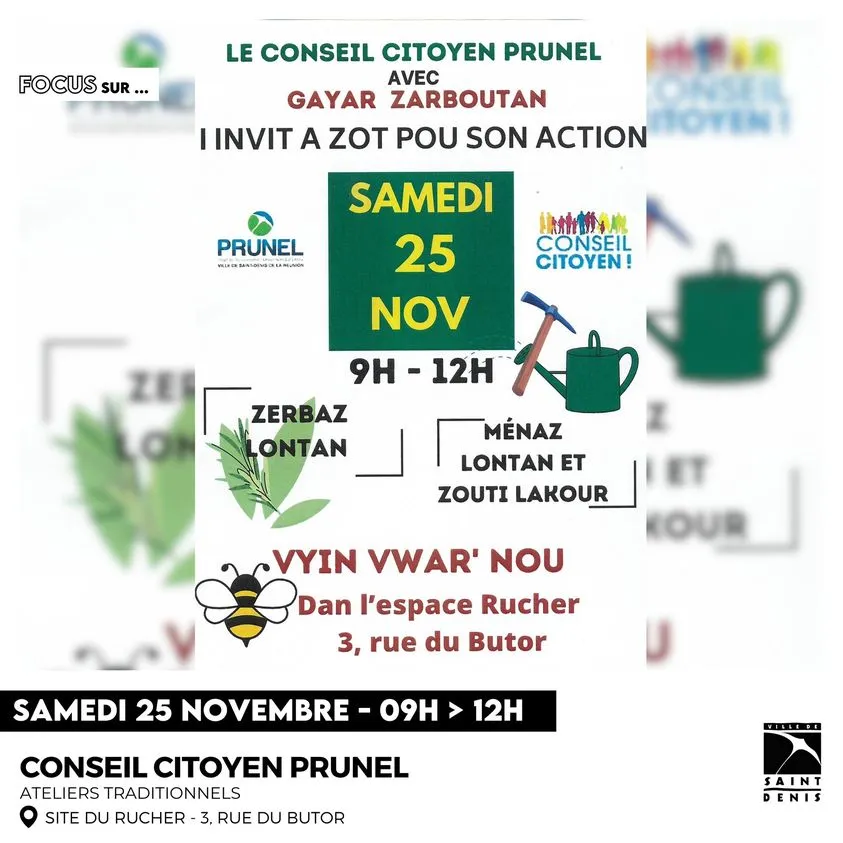 La Ville Citoyenne de Saint-Denis organise une matinée dédiée à l’action citoyenne, coordonnée par le Conseil Citoyen de PRUNEL. Deux ateliers traditionnels seront disponibles :