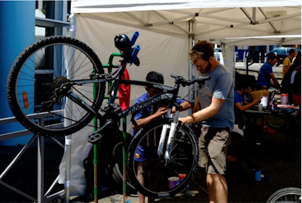 Etienne, coordinateur du projet, se réjouit de l’affluence de l’atelier : “Aujourd’hui, il s’agit du 4ème atelier VéloKlinik . Nous sommes ravis car il y a toujours plus de participants, et un nombre de bénévoles qui ne faiblit pas. Tout ça crée une belle dynamique qui fait plaisir et donne envie de continuer sur notre lancée. Cependant, l’organisation d’un atelier itinérant sur un lieu public comme aujourd’hui demande une grosse logistique avant et après l’atelier, puisque nous devons transporter à chaque fois sur site tout notre matériel de réparation et un grand nombre de pièces détachées. Nous sommes à la recherche d’un local sur Saint-Denis qui nous permettrait de mettre en place un atelier équipé permanent dans un quartier et d’organiser plus souvent des évènements de réparation ou de formation et de réparer beaucoup plus de vélos !”.