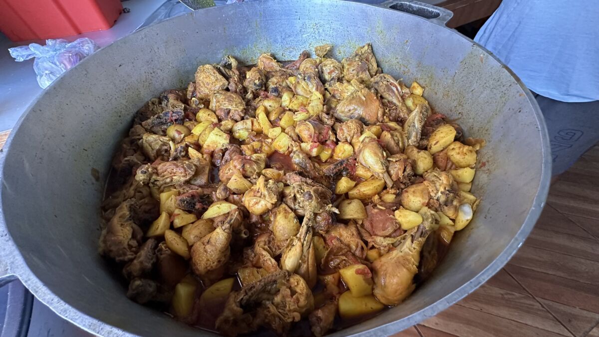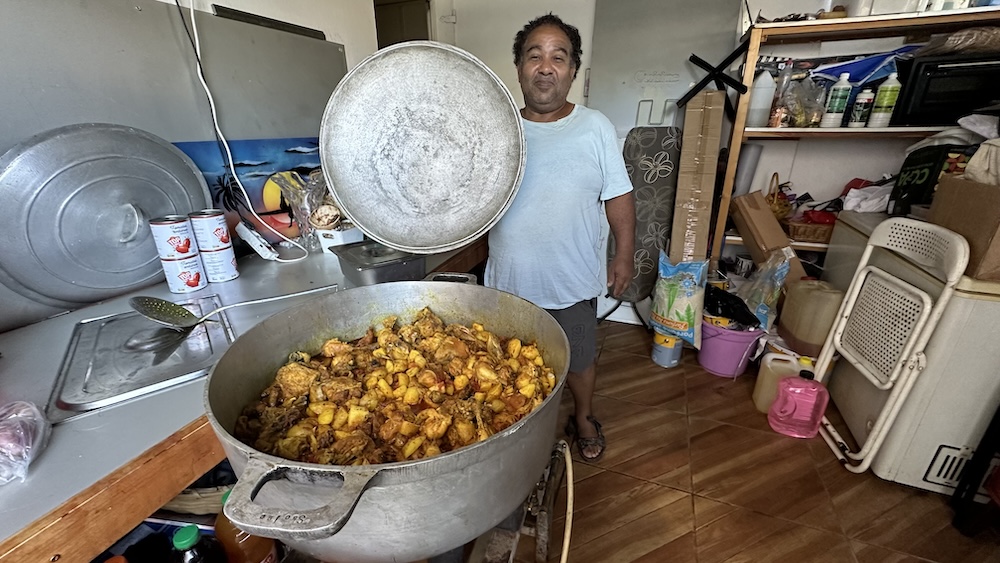 Monsieur Tirel, mobilisé depuis 3 heures du matin, est en train de préparer un grand cari poulet aux pommes de terre, accompagné d’une quantité de riz considérable. Pour le dessert, il fait appel à la générosité des bazardiers ou du planteurs de letchis, invitant ceux qui souhaitent faire un geste à distribuer des ballots.
