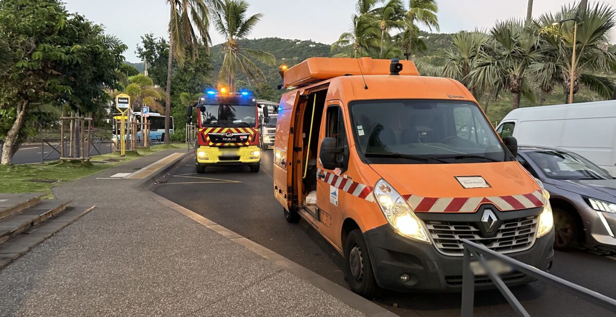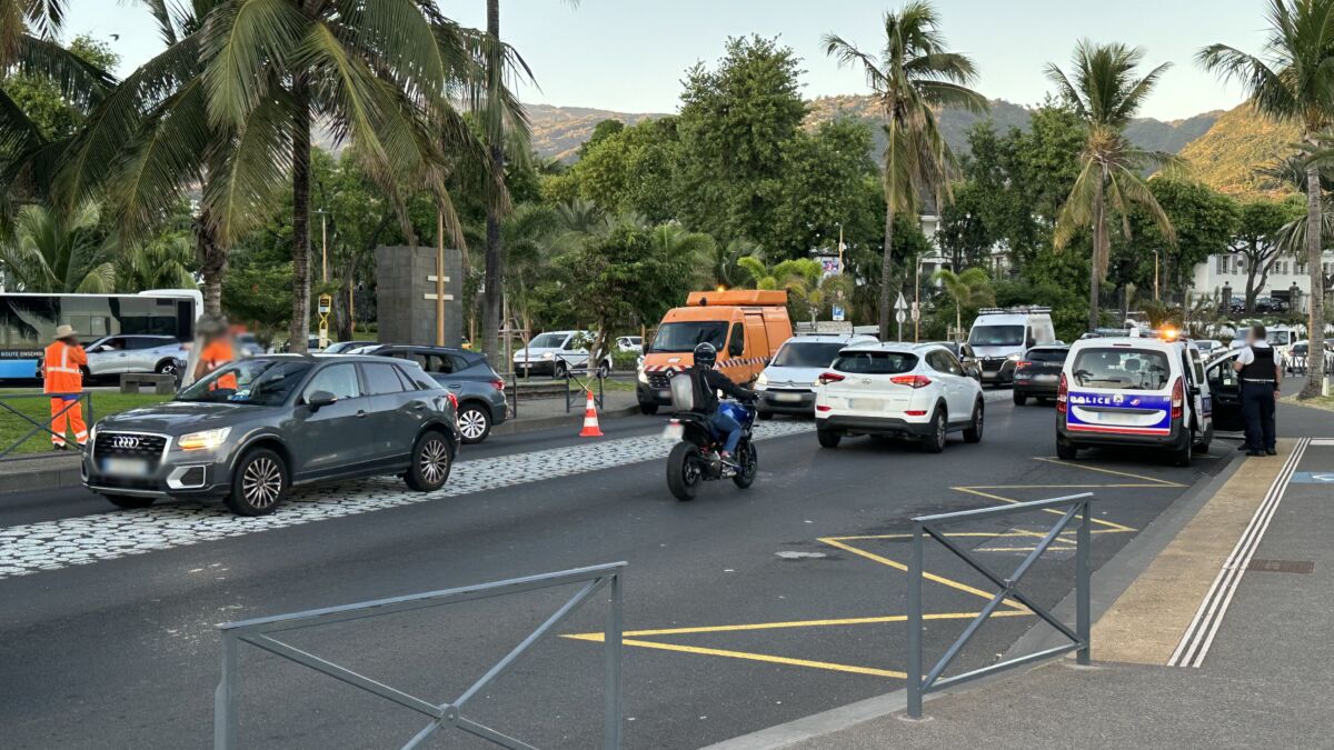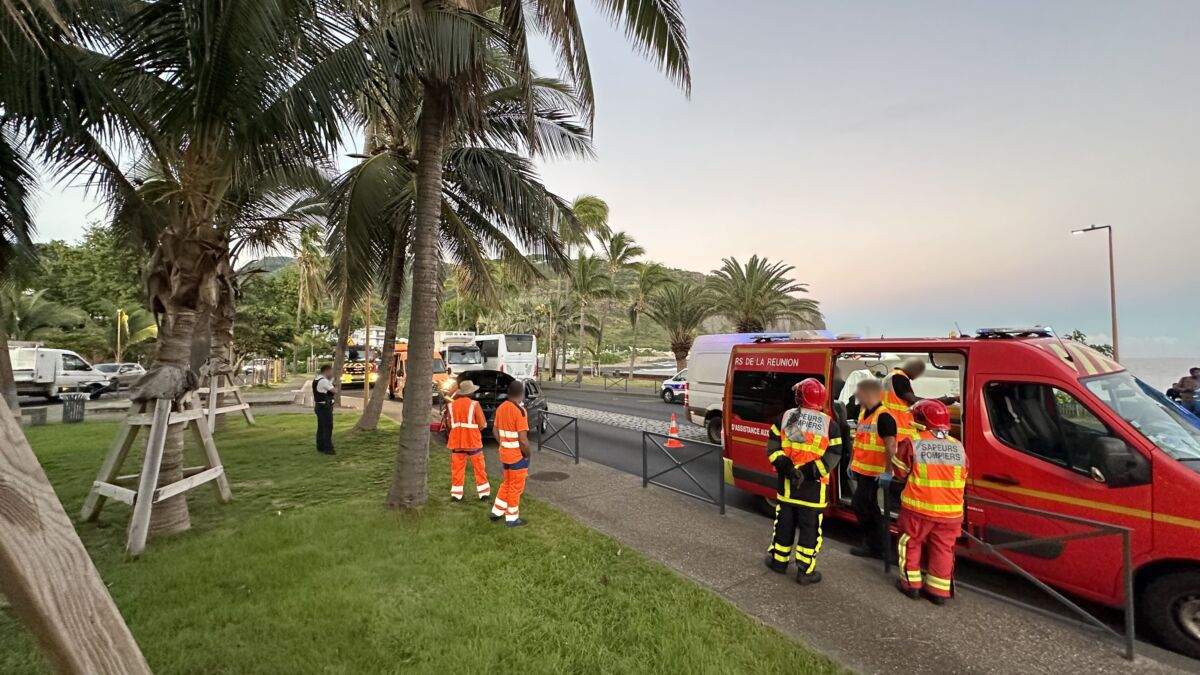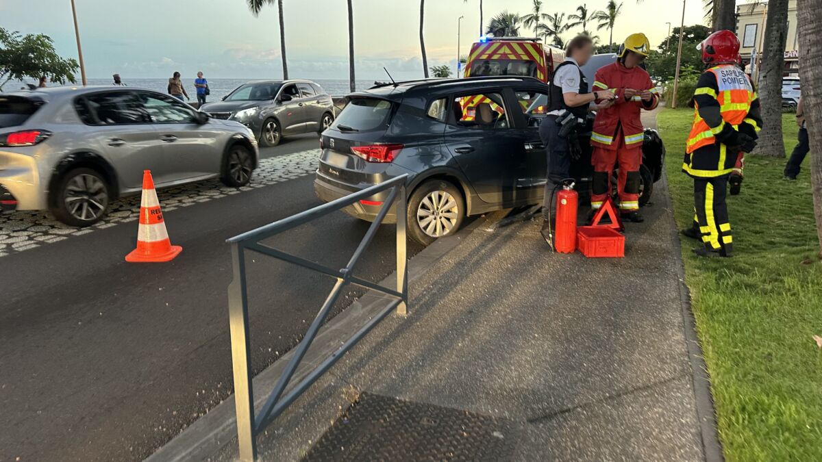 À 6h45, un premier accident nous a été signalé sur la double voie du Barachois, face à l’arrêt de bus Car Jaune « Barachois ». La barrière de protection piéton a été littéralement pliée par la puissance du choc. Le véhicule venait de sortir de la « NRL » et, pour une raison inconnue, le conducteur a fait une embardée sur la gauche, montant sur le trottoir heureusement désert à cette heure matinale. La police nationale était sur place avec un équipage, les pompiers avec deux véhicules et aussi la DDR avec un équipage et un véhicule. On circule difficilement depuis la Cité des Arts en direction de la NRL et du centre-ville.