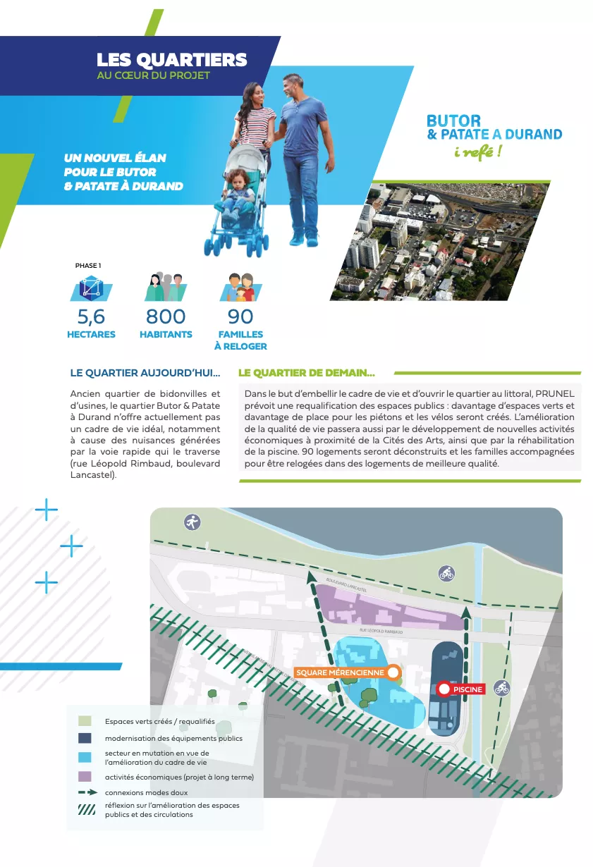 Les quartiers de la ville de Saint-Denis concernés par ce projet sont trois quartiers classés Politique de la Ville : le Butor & Patate à Durand, Vauban et le bas Maréchal Leclerc.