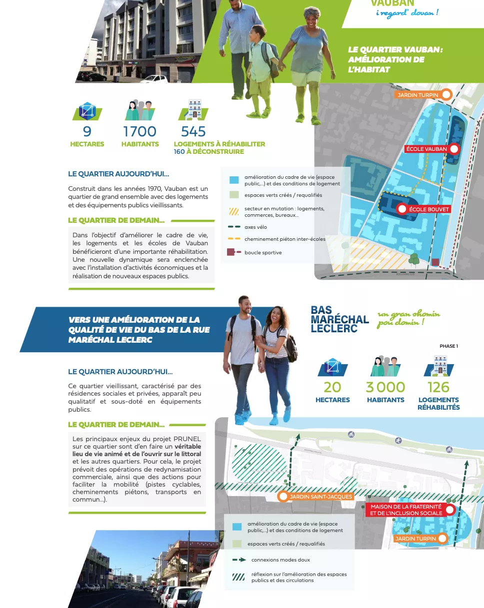 La transformation de Saint-Denis est engagée. Le projet de renouvellement urbain PRUNEL vise à réhabiliter 3 quartiers de la ville : le Butor & Patate à Durand, Vauban et le bas Maréchal Leclerc en apportant de nouveaux équipements, en améliorant les conditions de vie dans les logements pour les familles et en renouvelant le cadre de vie et l’espace public.