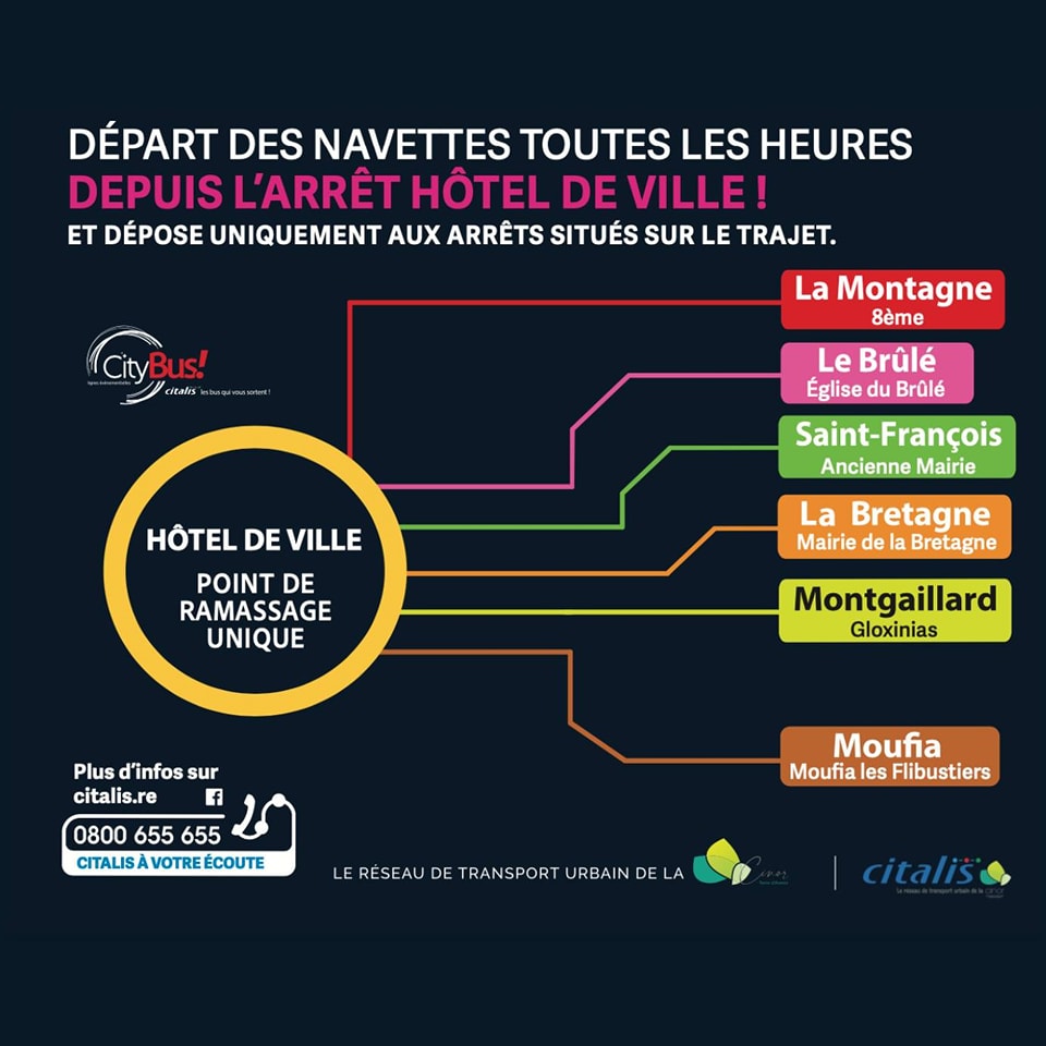 Dès 21h, cinq navettes GRATUITES desservant La Montagne 8ème, Le Brûlé, Saint-François, Montgaillard et La Bretagne seront mises en service. Ces navettes, d’une capacité de 8 places, assureront des rotations toutes les heures jusqu’à minuit, avec un point de ramassage unique à l’arrêt Hôtel de Ville de Saint-Denis.