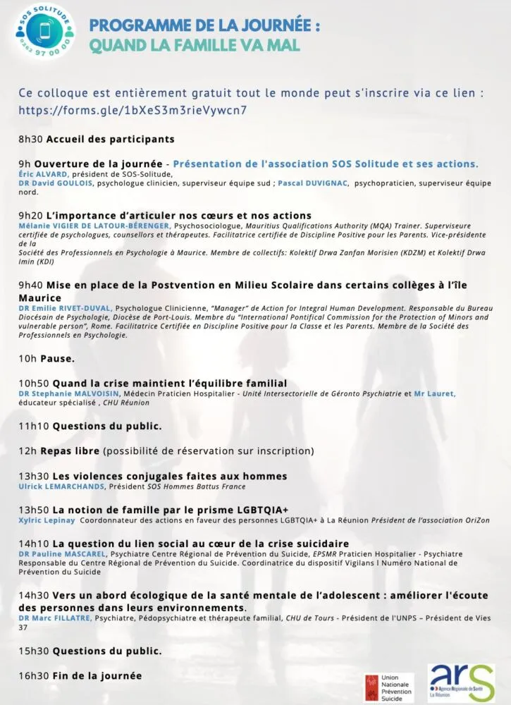 Le vendredi 24 février 2023, SOS Solitude organise la Journée Nationale de la Prévention du Suicide (JNPS) à l’hôtel Mercure Crèolia. Les JNPS à La Réunion font écho à celle organisé en Métropole à l’initiative de l’UNPS (Union Nationale de Prévention du Suicide) dont SOS-Solitude est le correspondant à La Réunion.