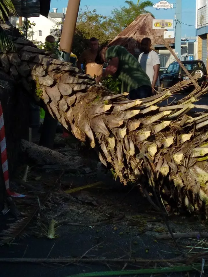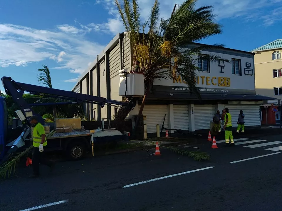 Illustration du coté du Butor où ce grand et vieux dattier est tombé durant le cyclone, cassant dans le même temps un poteau d’éclairage public. Il a été retiré et le site sécurisé dès 7h30 ce matin.