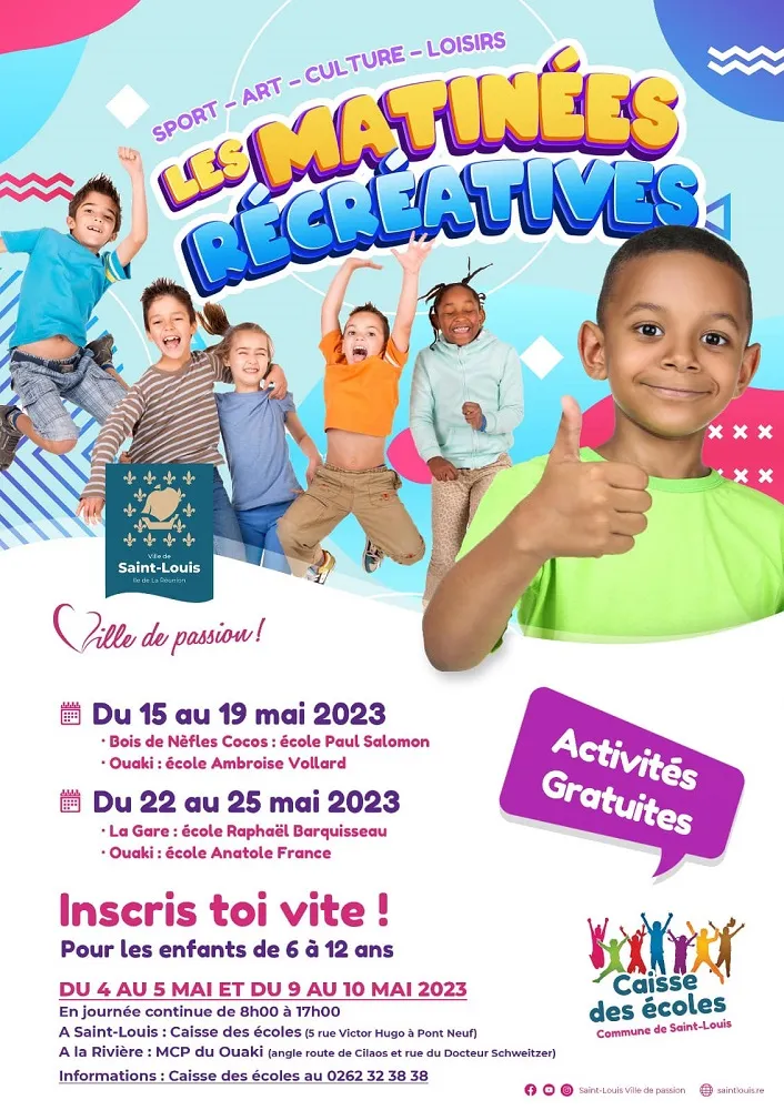 La Caisse des Écoles prépare pour les prochaines vacances de mai une palette d’activités pour les 6-12 ans et les 12-17 ans ! Deux centres d’accueil sont ainsi disponibles, l’un à Saint-Louis et l’autre à La Rivière. Fini les soucis de prise de rendez-vous via un seul numéro !