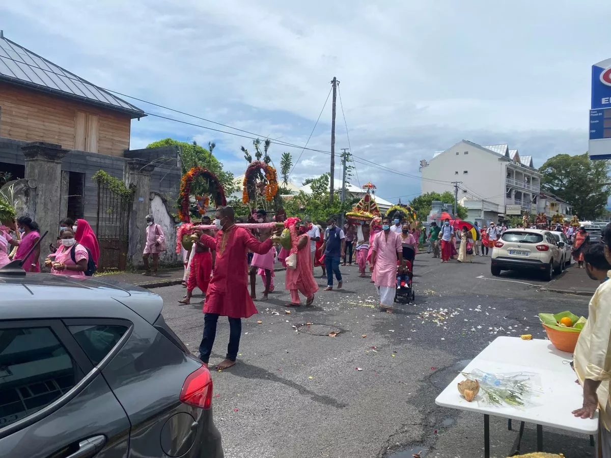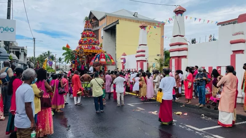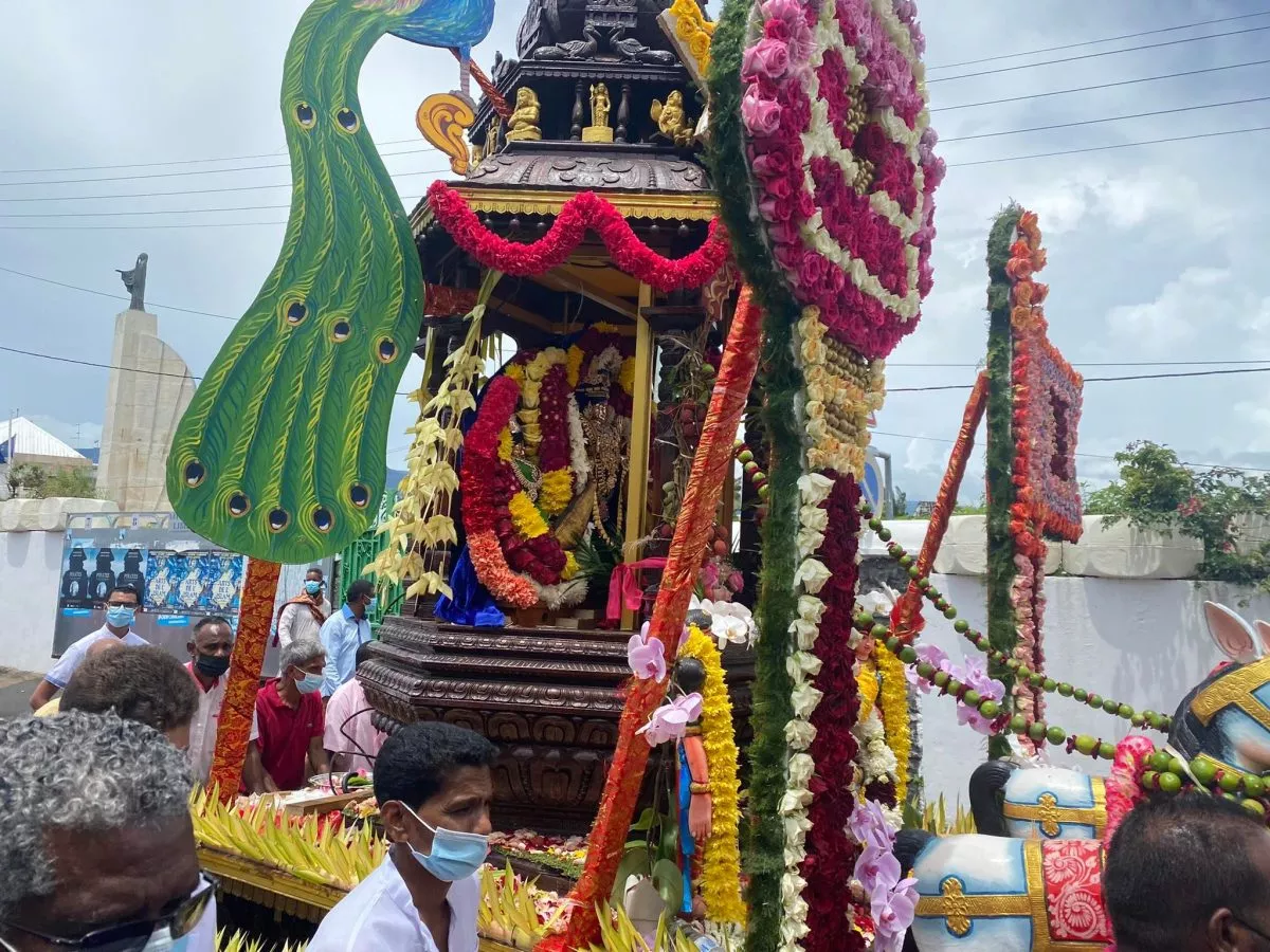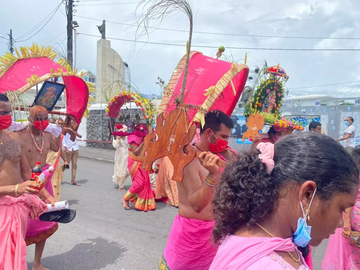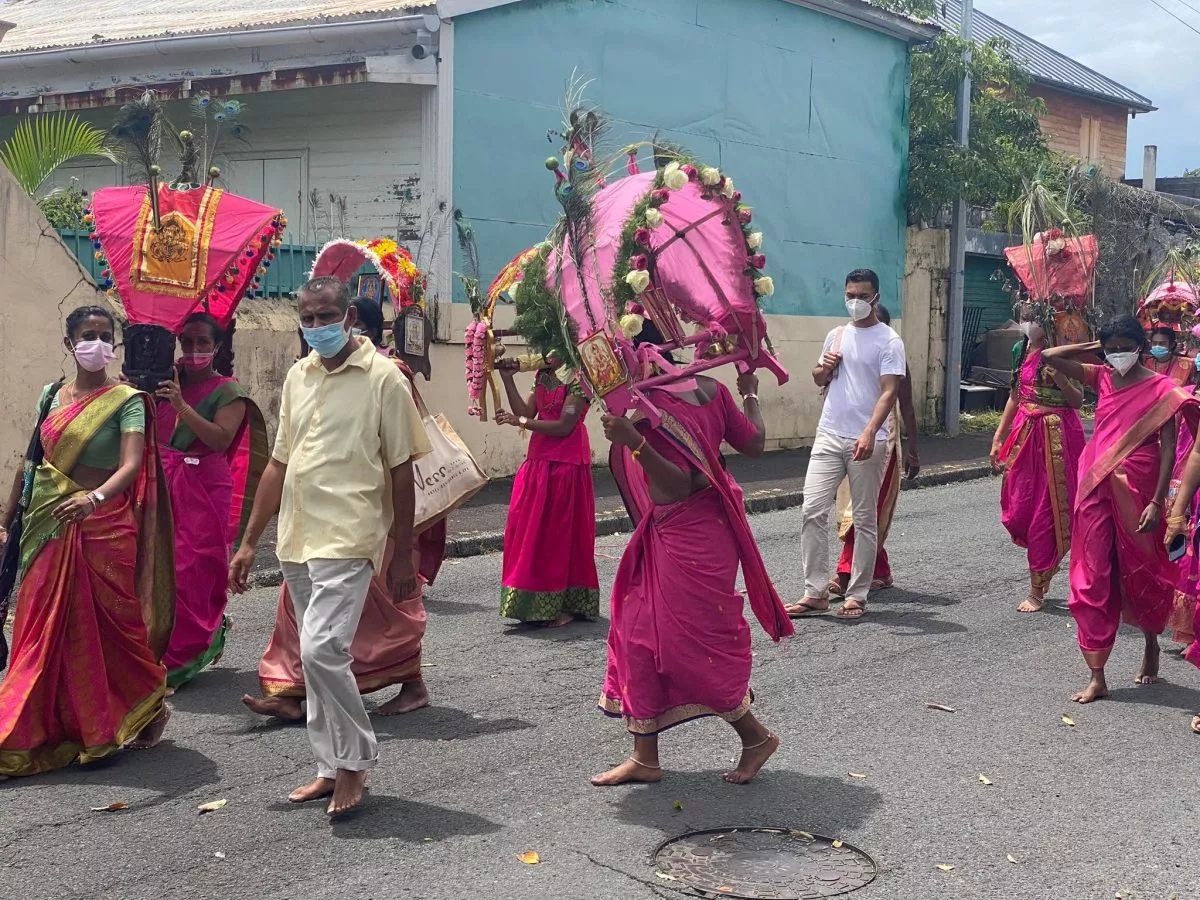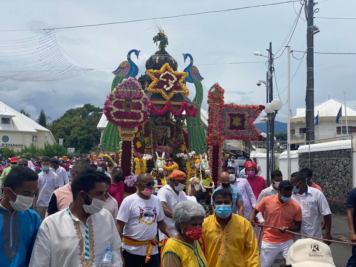 Superbe procession actuellement dans l’avenue principale de Saint Louis , qui se retrouve fermée et ce, jusqu’à 15H30. Les fidèles malbar procèdent au transport du Cavadee dans les rues de la commune jusqu’au Temple où des prières se feront en l’honneur du Dieu Mourouga.