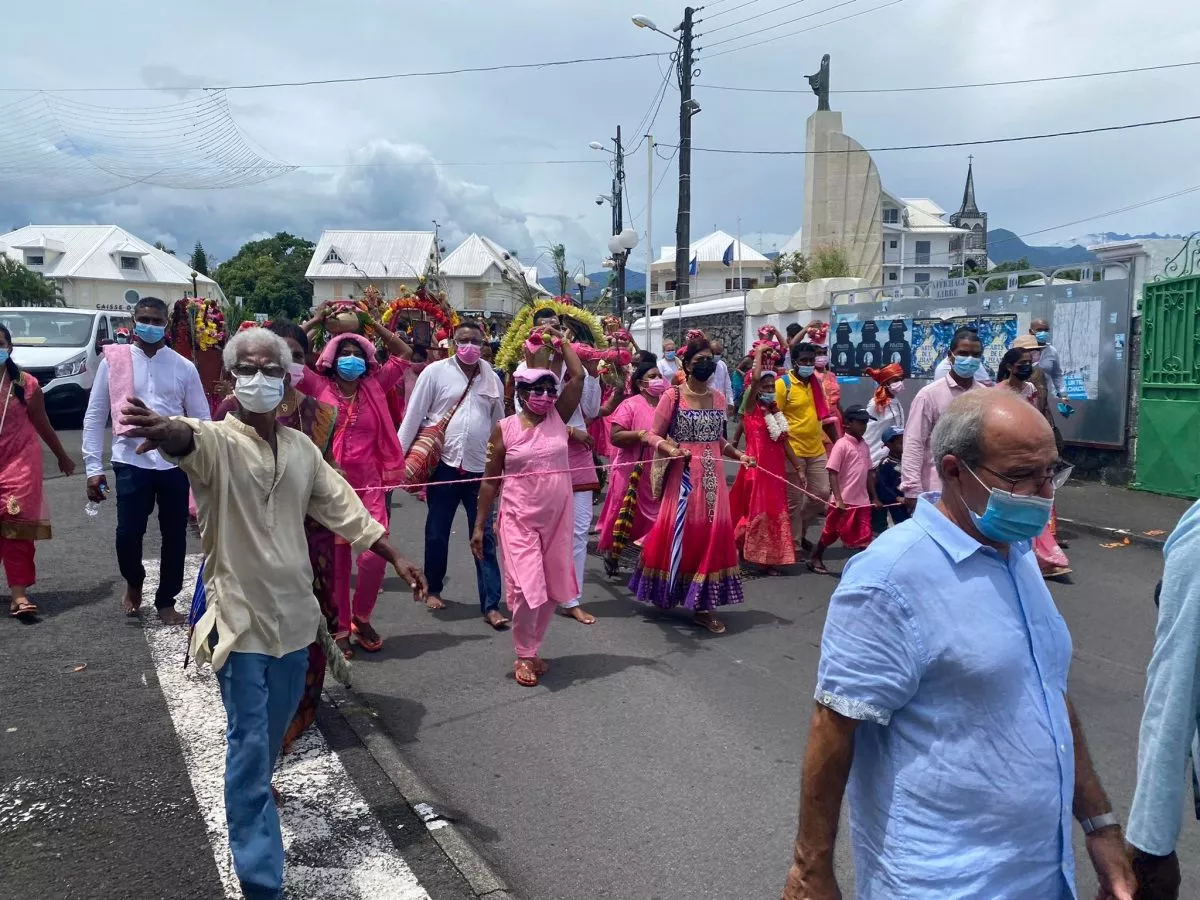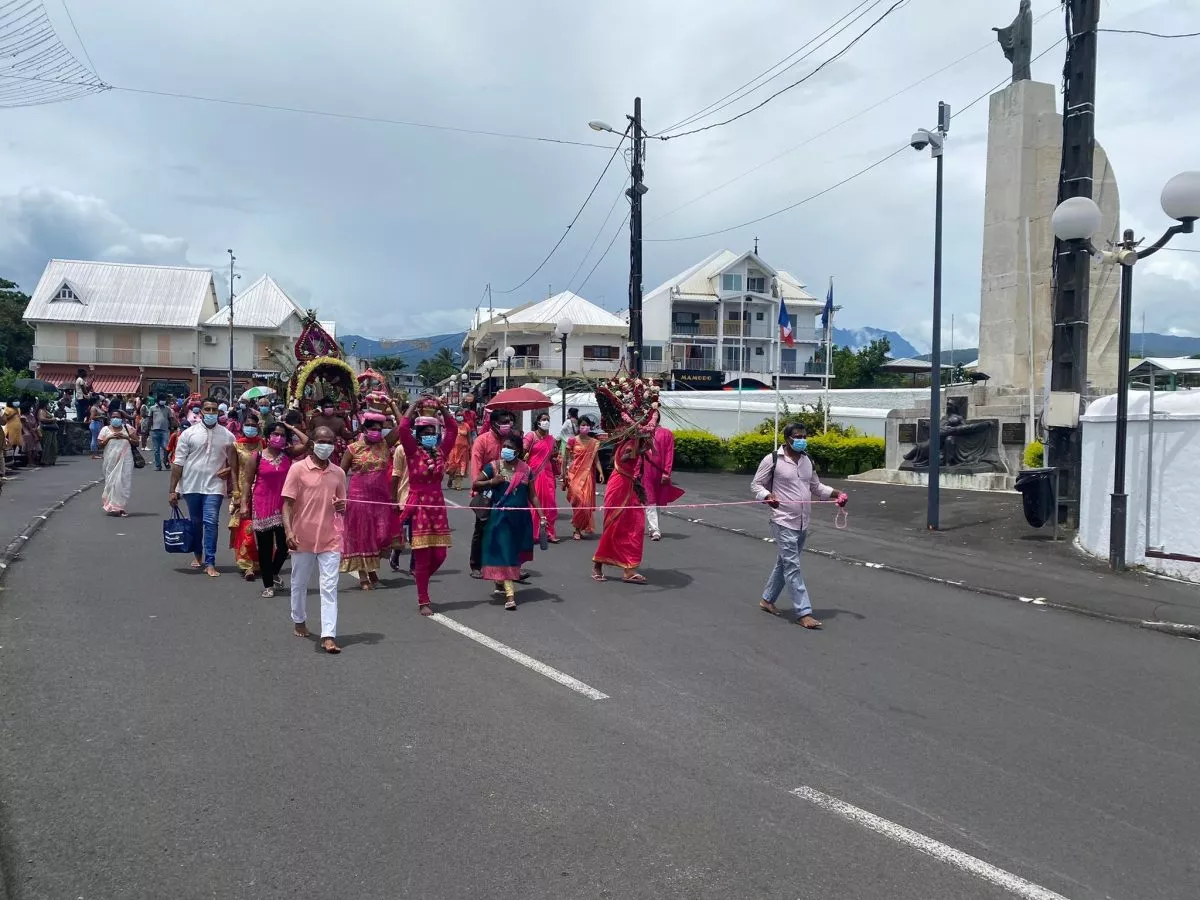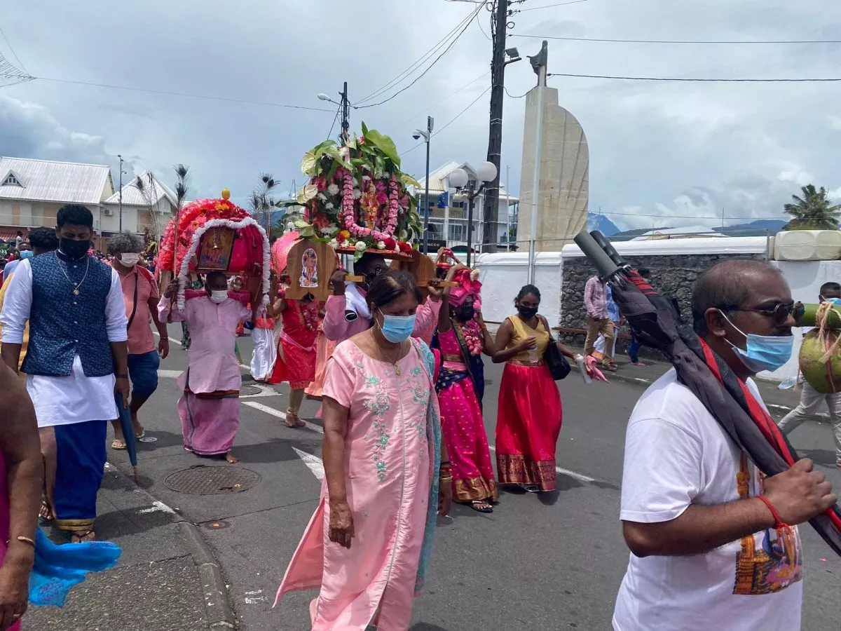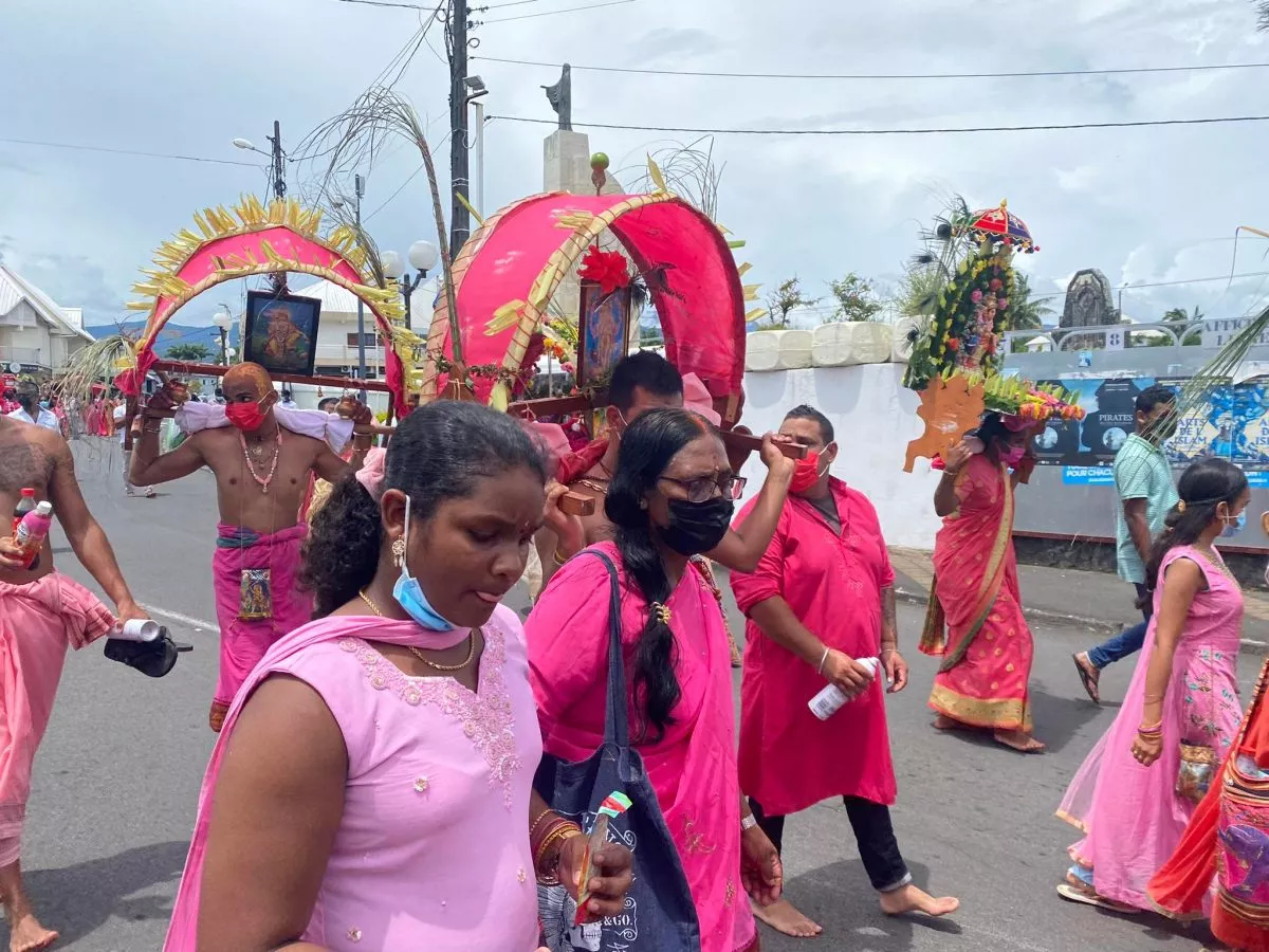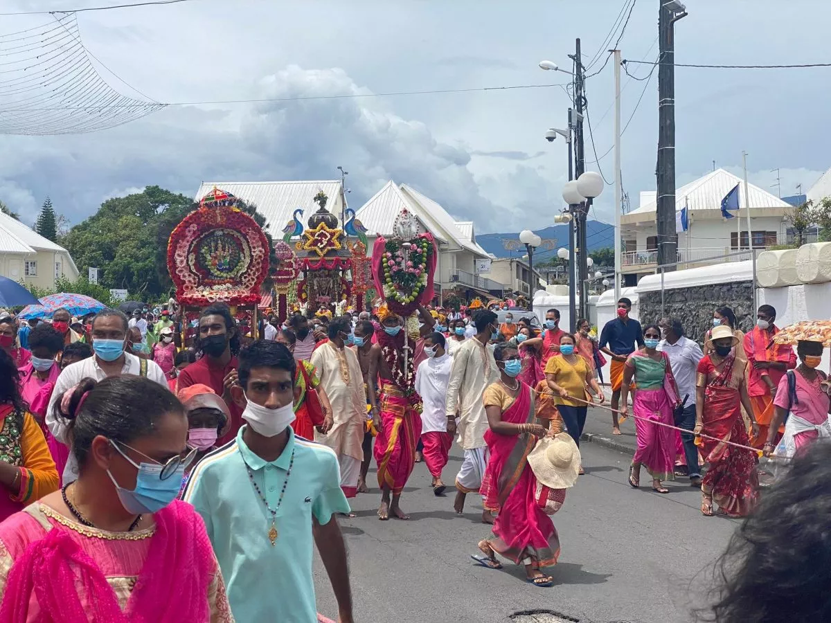 Superbe procession actuellement dans l’avenue principale de Saint Louis , qui se retrouve fermée et ce, jusqu’à 15H30. Les fidèles malbar procèdent au transport du Cavadee dans les rues de la commune jusqu’au Temple où des prières se feront en l’honneur du Dieu Mourouga.