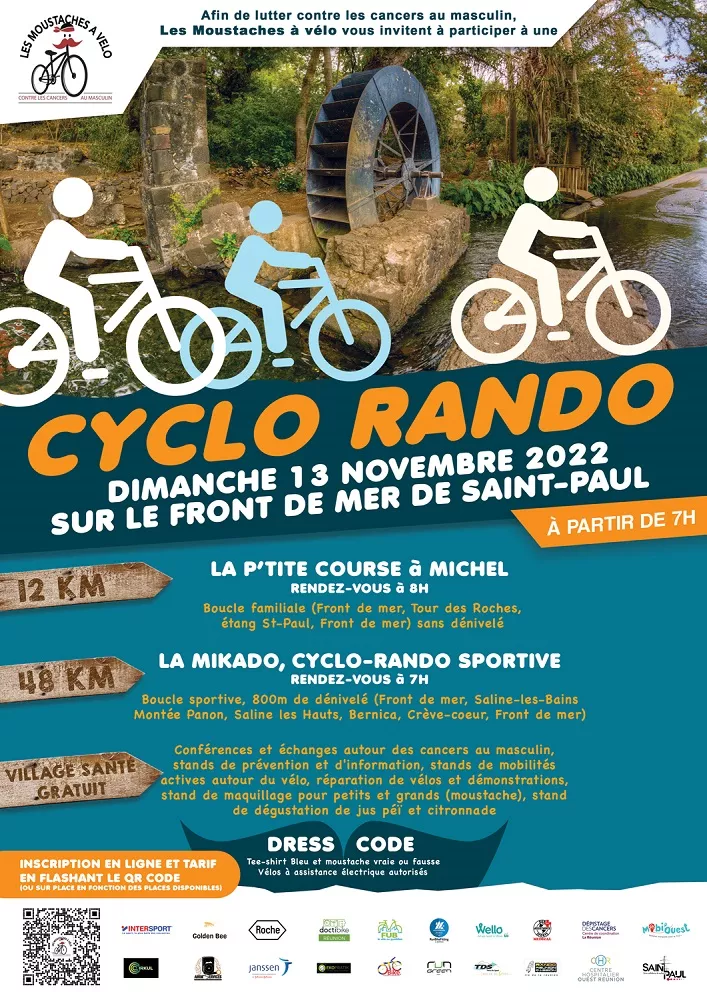 Jeudi 03 novembre 2022, l’Association Les moustaches à vélo et la ville de St Paul organisaient une conférence de presse afin de présenter la cyclo rando, une manifestation organisée dans le cadre de la lutte contre les cancers masculins et des mobilités actives qui aura lieu le 13 novembre 2022. N’oubliez pas votre t-shirt bleu et votre moustache si vous souhaitez participer à l’événement.