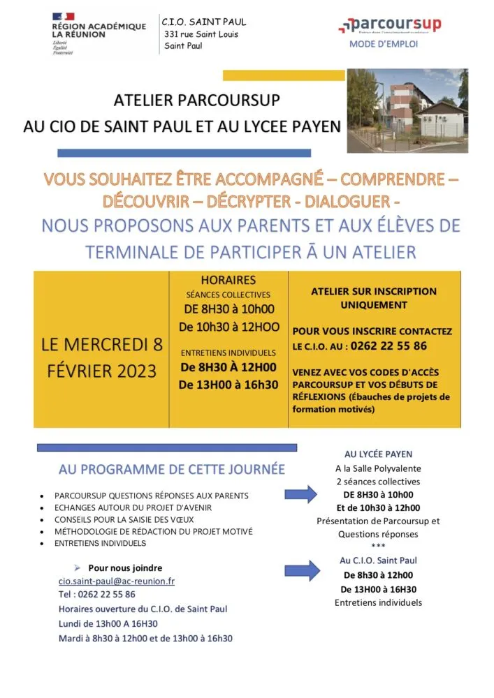 Les ateliers PARCOURSUP se dérouleront toute la journée du Mercredi 8 février 2023, avec 2 séances collectives à la salle polyvalente du LYCÉE PAYEN à Saint-Paul avec :