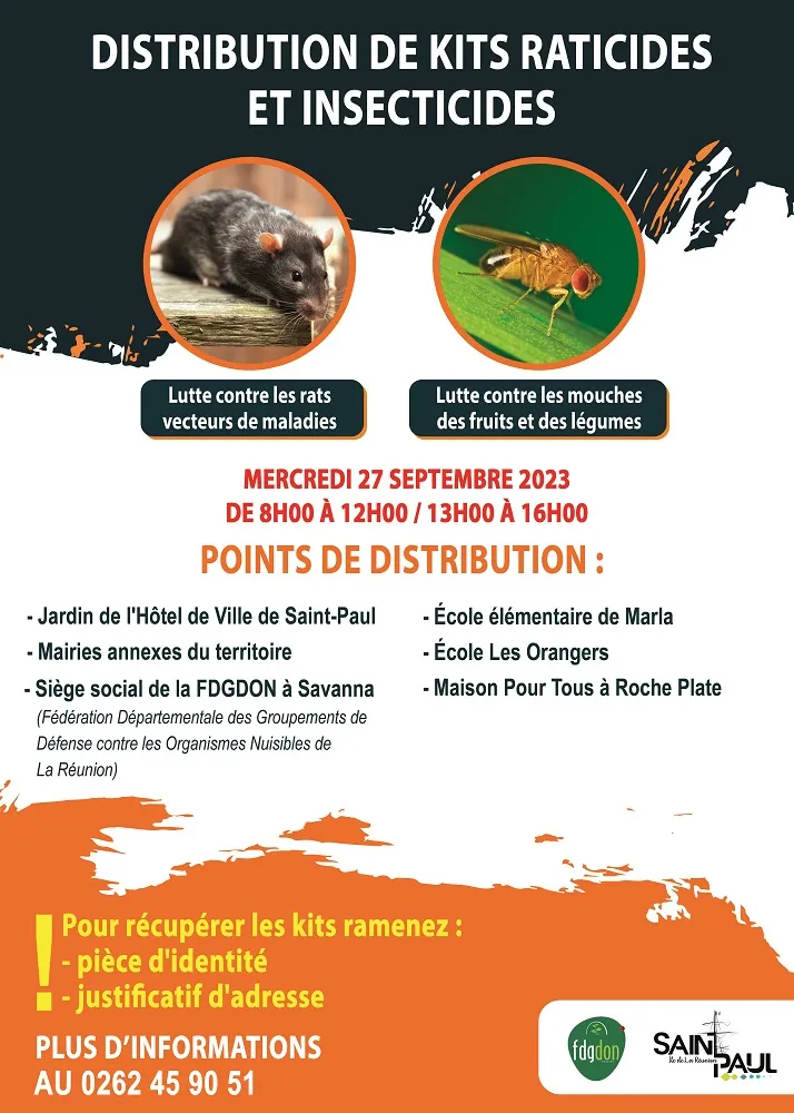 Les habitants de St-Paul ont rendez-vous le 27 septembre pour une distribution de kits raticides et insecticides. L’événement se déroulera de 8h à 12h et de 13h à 16h. N’oubliez pas d’apporter votre pièce d’identité et un justificatif de domicile pour bénéficier de cette initiative.