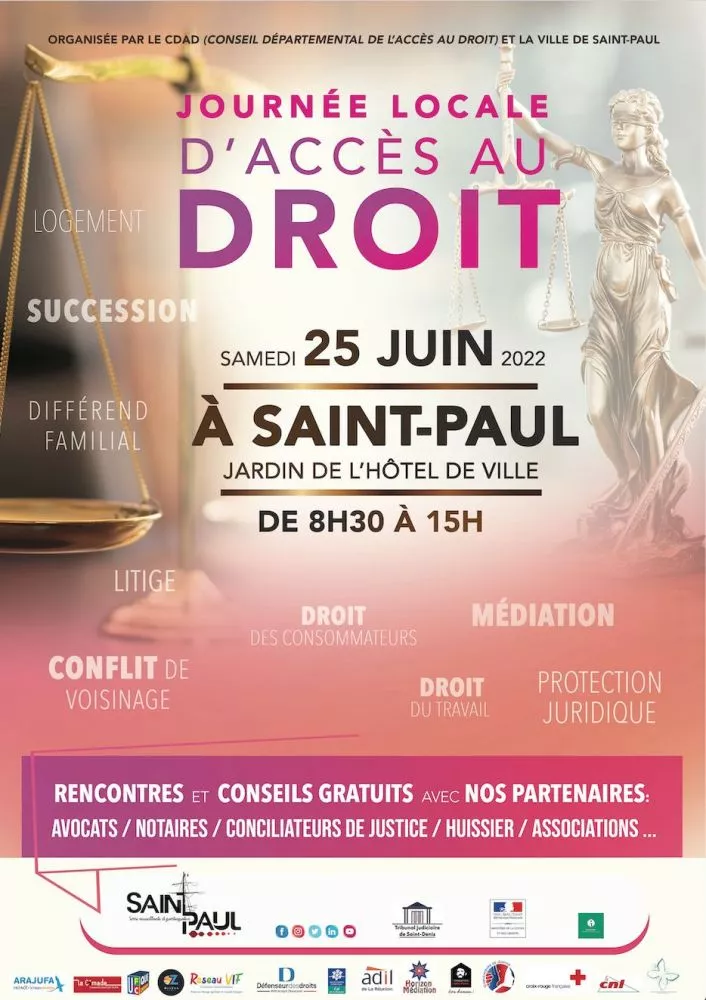 Collectivités/Saint-Paul St-Paul : Journée Locale de l’Accès au Droit ce samedi par La Rédaction 24 juin 2022 1 min de lecture Une journée Locale de l’Accès au Droit se tiendra dans les Jardins de l’Hôtel de Ville ce samedi 25 juin de 8H30 à 15H. Organisée par le Conseil Département d’Accès au Droit de La Réunion (CDAD) en partenariat avec la Ville de Saint-Paul. Ne manquez pas toute l’actualité de La Réunion ! Abonnez-vous à la newsletter de Free Dom ! Valider Partager Facebook Twitter Pinterest Linkedin Whatsapp Reddit Email Catégorie: avocatdroitNotaire Vous pourriez être intéressé par 29 décembre 2025 Point sur le réseau routier départemental, 29 décembre à 16H30 29 décembre 2025 Fortes pluies : appel à la plus grande prudence à Saint-Paul 29 décembre 2025 Intempéries : radiers submergés à Trois Bassins et à Saint-Paul La Rédaction Laisser un commentaire Annuler la réponseYour email address will not be published. Enregistrer mon nom, mon e-mail et mon site dans le navigateur pour mon prochain commentaire. Current ye@r * Leave this field empty Article précédent Le Grand Prado : théâtre de deux journées d’animation et de sensibilisation à destination du public scolaire Article suivant Un spectacle d’improvisation à St-Joseph Articles récents... Mercredi 31 décembre 2025 – Météo, éphéméride et horoscope du jour Hommage à Johnny Hallyday sur Free Dom 2 ce 5 décembre Mardi 30 décembre 2025 – Météo, éphéméride et horoscope du jour Saint-Joseph : découverte de 2337 plants de cannabis, arrestation de 2 individus Point sur le réseau routier départemental, 29 décembre à 16H30 Suicide sur le pont de la Rivière d’Abord : importante mobilisation des secours et des forces de l’ordre Radier submergé à Ilet Furcy : la route de Cilaos fermée à la circulation cette nuit Fortes pluies : appel à la plus grande prudence à Saint-Paul Saint-Gilles-les-Bains : une route impraticable, les riverains montent au créneau (VIDEOS) Très grands excès de vitesse : un délit passible de prison depuis le 29 décembre 2025