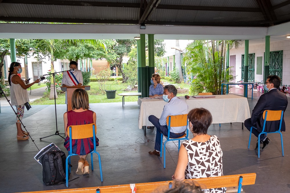 Académie de La Réunion , Chantal MANÈS-BONNISSEAU, officialisent par la signature, la convention « Écoles numériques 2020 » et de la création des « Espaces Numérique de Travail » sur le territoire Saint-Paulois. Salim NANA-IBRAHIM, élu en charge du Plan Éducatif Global et Nila RADAKICHENIN, déléguée aux affaires scolaires les accompagnaient.