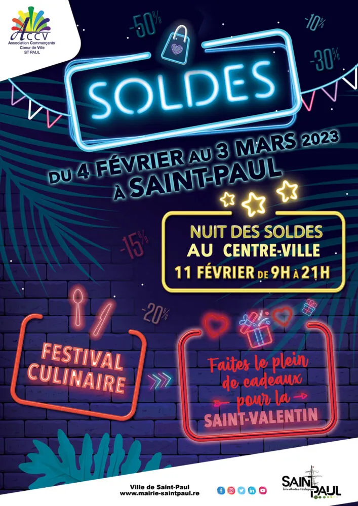 Venez profiter des bonnes affaires ! Du 04 février au 3 mars 2023, les commerçants du centre-ville de Saint-Paul vous attendent nombreux pour des promos de folie. Et ce n’est pas terminé ! Le 11 février, n’oubliez pas : c’est la Nuit des soldes et le Festival culinaire ! De nombreuses animations vous y attendent même pour la Saint-Valentin. Alors, alé di partout !