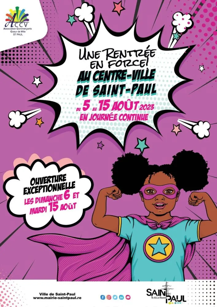 Pour une rentrée en force, les commerçants du coeur de ville de Saint-Paul (ACCV) vous accueillent du 5 au 15 août 2023 en journée continue !