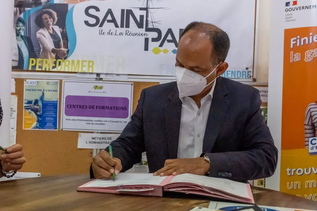 Ce vendredi 11 mars 2022, le Maire de Saint-Paul, Emmanuel SÉRAPHIN et Astrid COMBÉMOREL, Directrice régionale adjointe de Pôle Emploi ont signé une convention de partenariat à la plateforme des services publics du Guillaume.