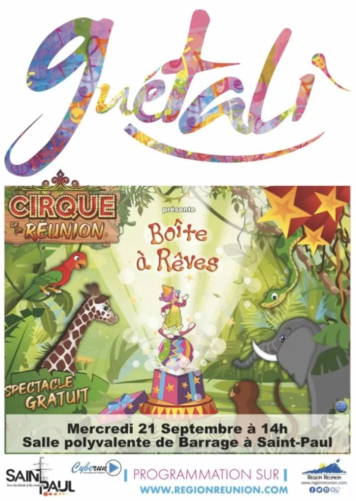 Saint-Paul, terre des festivals, accueille le spectacle gratuit, intitulé La Boîte à rêves, joué près de la salle polyvalente de Barrage dans le Bassin de vie de la Saline. Rendez-vous le mercredi 21 septembre 2022 à 14 heures. Ce rendez-vous s’adresse aux 3 à 12 ans.
