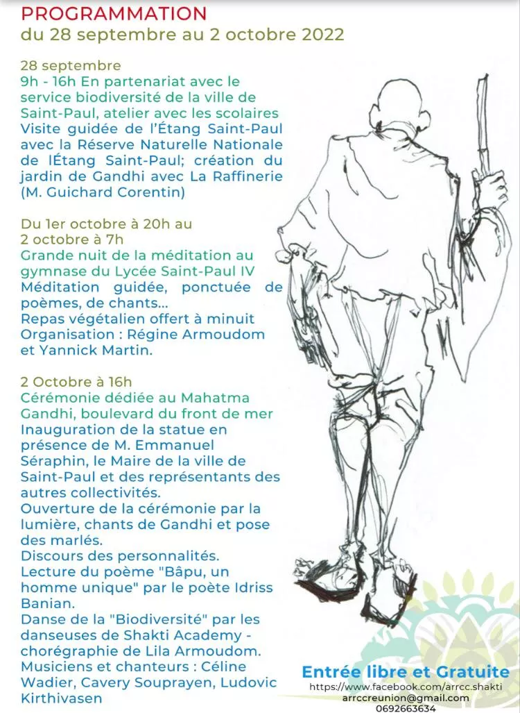 Plus précisément sur le boulevard du front de mer de Saint-Paul. Il y aura également des animations diverses ainsi qu’une nuit entière consacrée à la méditation. Une manifestation qui a début aujourd’hui, mercredi 28 septembre, et qui s’achèvera ce dimanche. Une initiative de l’association ARRCC, en étroite collaboration avec d’autres partenaires. Ce matin, a eu lieu des travaux de préparation de l’emplacement où sera installée la statue du Mahatma Gandhi. Les enfants ont planté des fleurs.