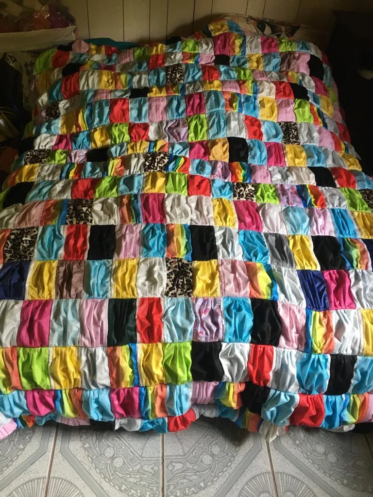 Un joli édredon réalisé en patchwork avec des masques depuis la Covid par Mme PAYET du Tremblet St-Philippe, âgée de 88 ans. De la patience, il lui en a fallu pour le réaliser, entièrement à la main.