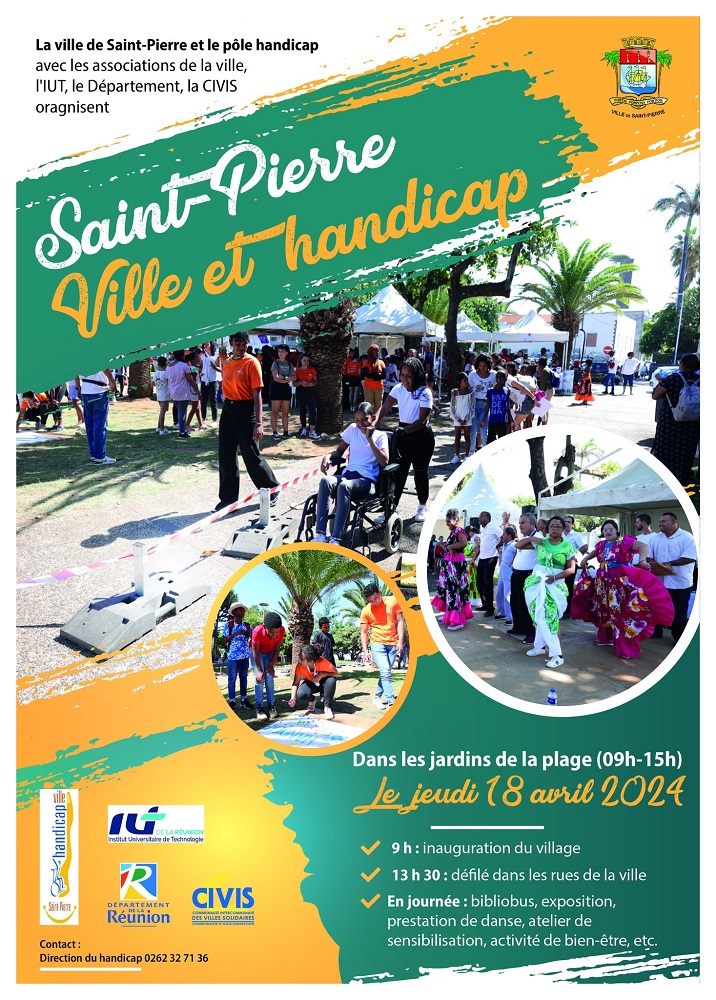 La ville de St-Pierre, en collaboration avec le pôle handicap, les associations locales, l’IUT, le département et la Civis, a organisé l’évènement « St-Pierre Ville et Handicap » aux jardins de la plage le jeudi 18 avril. Cette journée de sensibilisation, qui s’est déroulée de 9h à 15h, a proposé un programme riche et varié visant à promouvoir l’inclusion et à encourager la compréhension des défis liés au handicap.