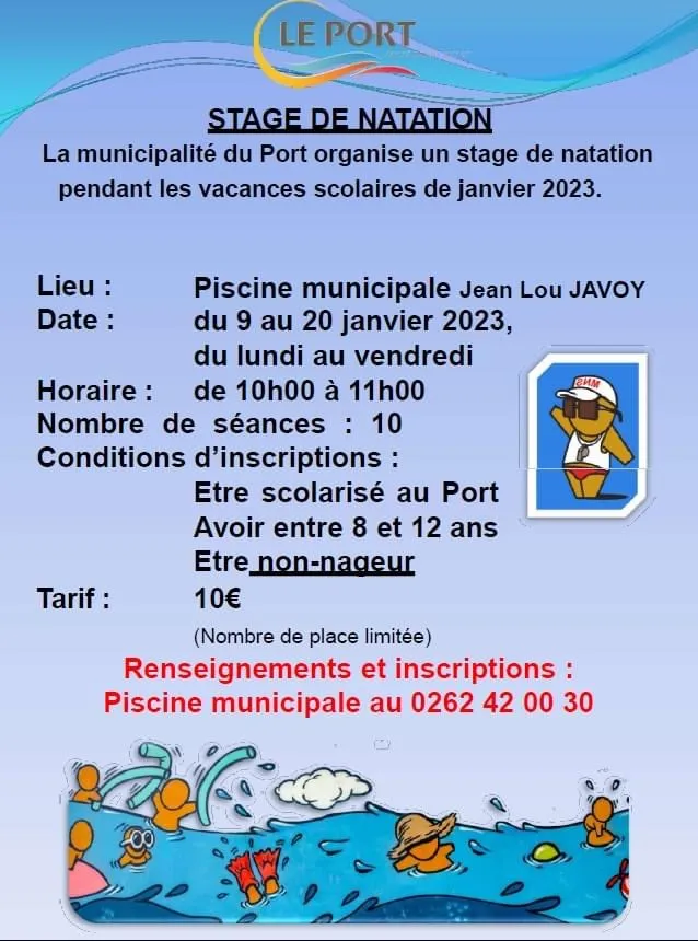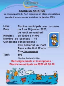 Collectivités/Le Port Stage de natation par Julie Nauche 2 janvier 2023 1 min de lecture Stage de natation. ♂ La municipalité du Port organise un stage de natation pendant les vacances scolaires de janvier 2023. Renseignement et inscription : 0262 42 00 30 Ne manquez pas toute l’actualité de La Réunion ! Abonnez-vous à la newsletter de Free Dom ! Valider Partager Facebook Twitter Pinterest Linkedin Whatsapp Reddit Email Vous pourriez être intéressé par 29 décembre 2025 Point sur le réseau routier départemental, 29 décembre à 16H30 29 décembre 2025 Fortes pluies : appel à la plus grande prudence à Saint-Paul 29 décembre 2025 Intempéries : radiers submergés à Trois Bassins et à Saint-Paul Julie Nauche Laisser un commentaire Annuler la réponseYour email address will not be published. Enregistrer mon nom, mon e-mail et mon site dans le navigateur pour mon prochain commentaire. Current ye@r * Leave this field empty Article précédent Huguette Bello présente ses vœux aux Réunionnais et fait le point sur l’année 2022 Article suivant La Possession : le sentier Grand Coin est interdit au public Articles récents... Mercredi 31 décembre 2025 – Météo, éphéméride et horoscope du jour Hommage à Johnny Hallyday sur Free Dom 2 ce 5 décembre Mardi 30 décembre 2025 – Météo, éphéméride et horoscope du jour Saint-Joseph : découverte de 2337 plants de cannabis, arrestation de 2 individus Point sur le réseau routier départemental, 29 décembre à 16H30 Suicide sur le pont de la Rivière d’Abord : importante mobilisation des secours et des forces de l’ordre Radier submergé à Ilet Furcy : la route de Cilaos fermée à la circulation cette nuit Fortes pluies : appel à la plus grande prudence à Saint-Paul Saint-Gilles-les-Bains : une route impraticable, les riverains montent au créneau (VIDEOS) Très grands excès de vitesse : un délit passible de prison depuis le 29 décembre 2025