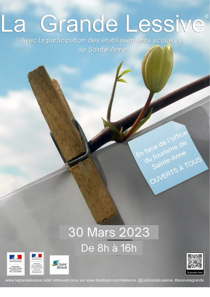 A l’occasion de la 33e édition de l’opération internationale « La grande lessive », les établissements scolaires de Sainte-Anne (écoles, collège de Bassin bleu et lycée Marie Curie) vous invitent à prendre part à la plus grande exposition d’art éphémère, le jeudi 30 mars 2023, de 8h à 16h en face de l’office du tourisme de Sainte Anne.
