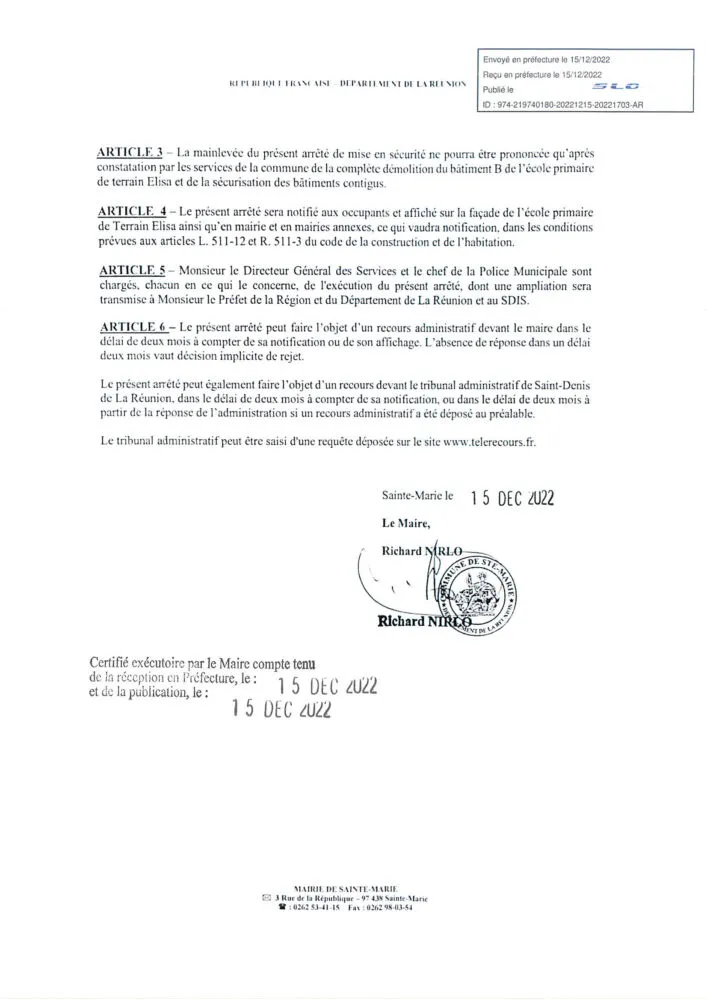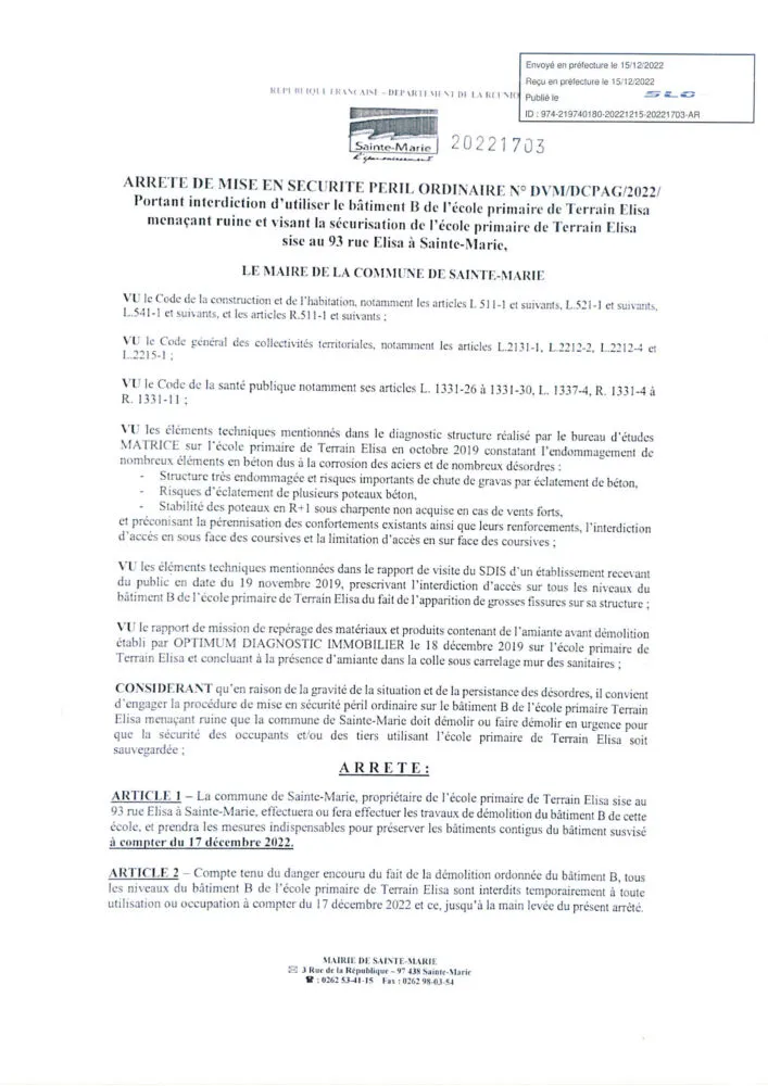 La commune de Sainte-Marie, propriétaire de l’école primaire de Terrain Elisa sise au 93 rue Elisa à Sainte-Marie, effectuera ou fera effectuer les travaux de démolition du bâtiment B de cette école, et prendra les mesures indispensables pour préserver les bâtiments contigus du bâtiment susvisé à compter du 17 décembre 2022.