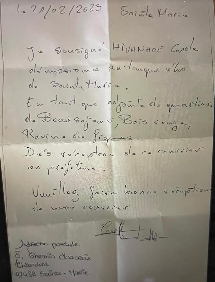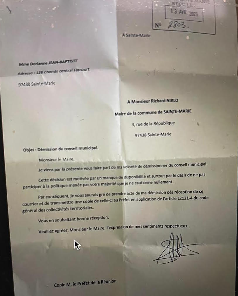 Dans le cas de Sainte-Marie, le maire Richard Nirlo et le préfet Jérôme Filippini ont bel et bien été non seulement informés de la décision de ces élus de ne plus honorer leur mandat mais, en plus, le premier magistrat de la commune et le représentant de l’Etat à la Réunion ont été destinataires des lettres de démission de ces élus  parmi lesquels figurent Dorianne Jean-Baptiste, Carole Ivanhoé, Arielle Rezac et Nicolas Lebreton. Affaire à suivre !