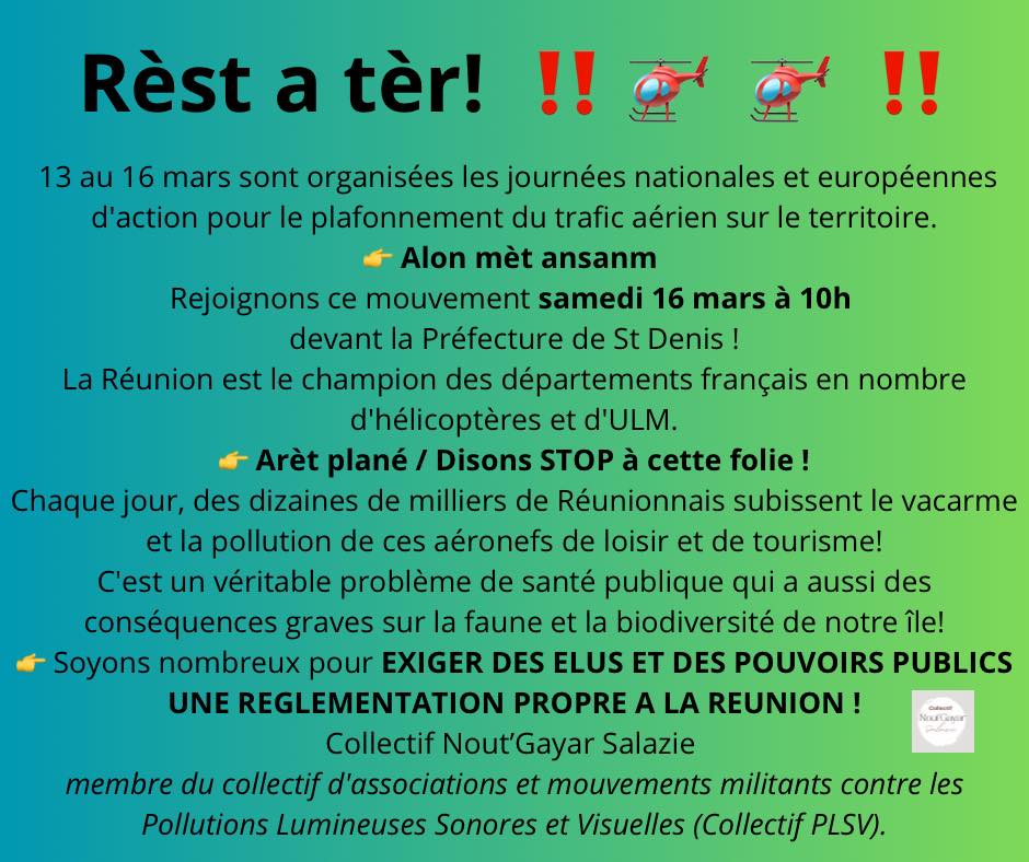 Ils ont vivement critiqué les nuisances sonores causées par les survols touristiques à La Réunion, les qualifiant d’« anti-écologiques » et « anti-économiques durables ». Ces dernières années, ces groupes affirment que le nombre de plaintes de la population locale concernant ce problème a considérablement augmenté.
