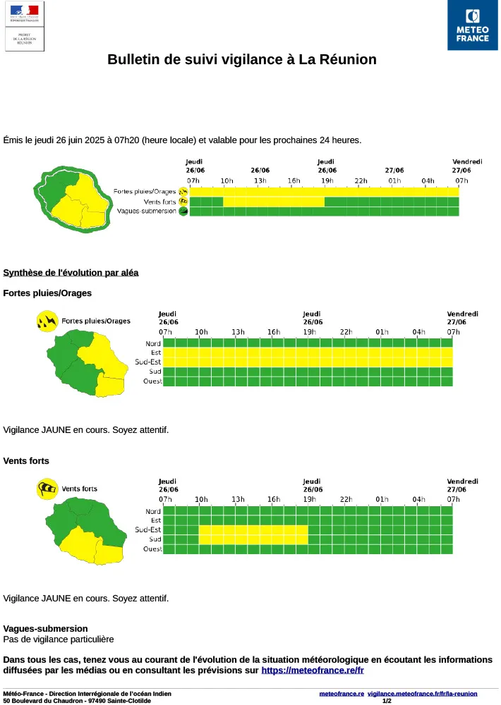 Par ailleurs, une vigilance jaune vents forts est également en vigueur ce jeudi, de 10h à 19h, sur le Sud et le Sud-Est de l’île. Des rafales pouvant atteindre 60 à 70 km/h sont attendues sur les hauteurs et les zones littorales exposées.