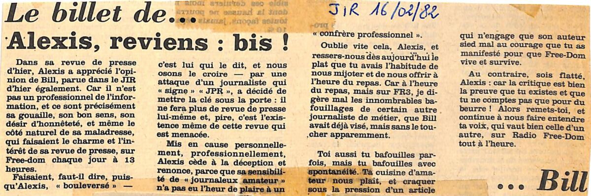 1982 Suite du feuilleton, Bill demande à Alexis de revenir ! par La Rédaction 16 février 1982 1 min de lecture Finalement, ce sont Pascaline, Clo et Benoît Ferrand qui prendront la relève des revues de presse sur Free Dom. Ne manquez pas toute l’actualité de La Réunion ! Abonnez-vous à la newsletter de Free Dom ! Valider Partager Facebook Twitter Pinterest Linkedin Whatsapp Reddit Email Vous pourriez être intéressé par 10 décembre 1982 Un canular par jour sur Radio Free Dom 11 octobre 1982 L’émission « pas de canard sans navet » 7 octobre 1982 L’émission « bleu outre-mer ou la radio de la méduse… » La Rédaction Laisser un commentaire Annuler la réponseYour email address will not be published. Enregistrer mon nom, mon e-mail et mon site dans le navigateur pour mon prochain commentaire. Current ye@r * Leave this field empty Article précédent Deux grands animateurs de l’époque : Alain Frappier et Solange Piéplu Article suivant Liste des candidats aux cantonales Articles récents... Hommage à Johnny Hallyday sur Free Dom 2 ce 5 décembre Mardi 30 décembre 2025 – Météo, éphéméride et horoscope du jour Saint-Joseph : découverte de 2337 plants de cannabis, arrestation de 2 individus Point sur le réseau routier départemental, 29 décembre à 16H30 Suicide sur le pont de la Rivière d’Abord : importante mobilisation des secours et des forces de l’ordre Radier submergé à Ilet Furcy : la route de Cilaos fermée à la circulation cette nuit Fortes pluies : appel à la plus grande prudence à Saint-Paul Saint-Gilles-les-Bains : une route impraticable, les riverains montent au créneau (VIDEOS) Très grands excès de vitesse : un délit passible de prison depuis le 29 décembre 2025 Fermeture temporaire du sentier de la Canalisation des Orangers (cirque de Mafate)
