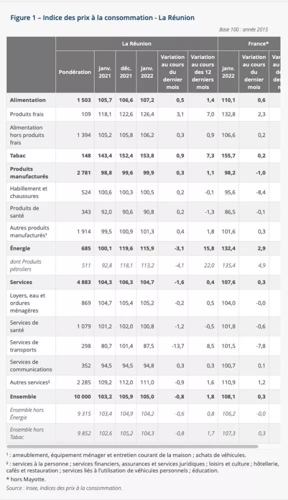 En janvier 2022, les prix à la consommation reculent de 0,8 % à La Réunion. Ils sont tirés à la baisse par les prix des services (- 1, 6 %) et par ceux de l’énergie (- 3,1 %). En revanche, les prix de l’alimentaire, des produits manufacturés et du tabac augmentent. Sur un an, les prix augmentent de 1,8 % à La Réunion, entraînés par la forte hausse des produits pétroliers malgré un ralentissement. C’est moins qu’en France hors Mayotte (+ 2,9 %).