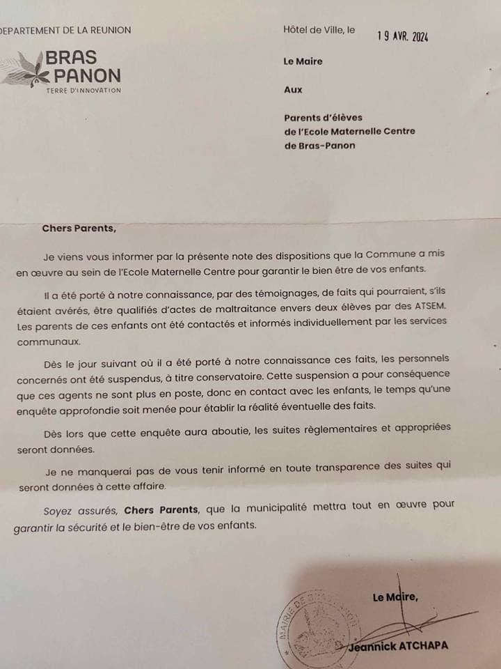 A zot aussi parents d’élèves montre au créneau contre la mairie si zot lé t au courant plusieurs mois nous peux plus laisser faire les choses graves comme ça j’espère que mr le maire va faire pour une fois son boulot de maire parce que lui aussi il est responsable de nos enfants