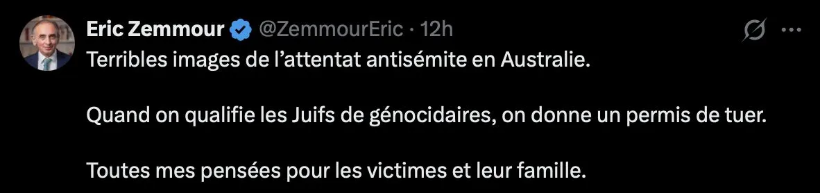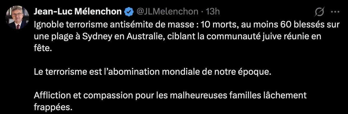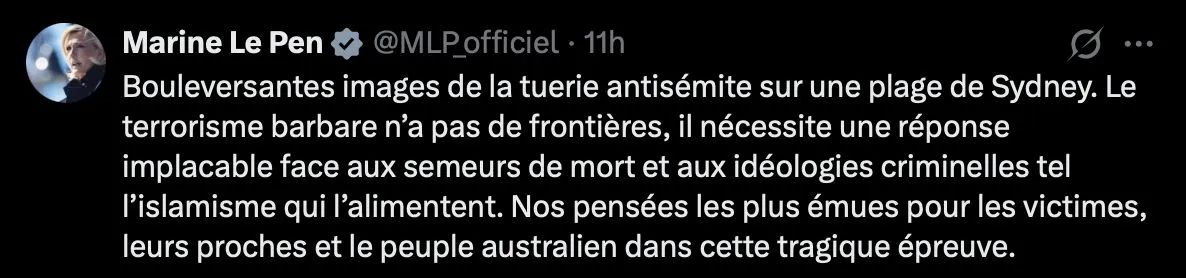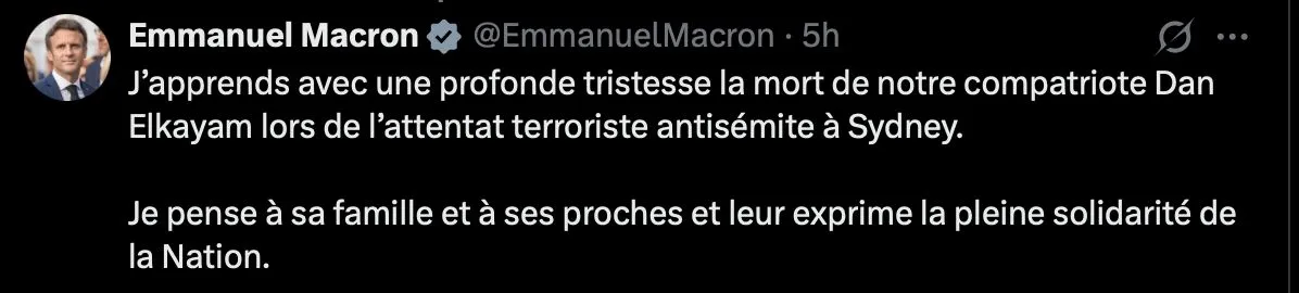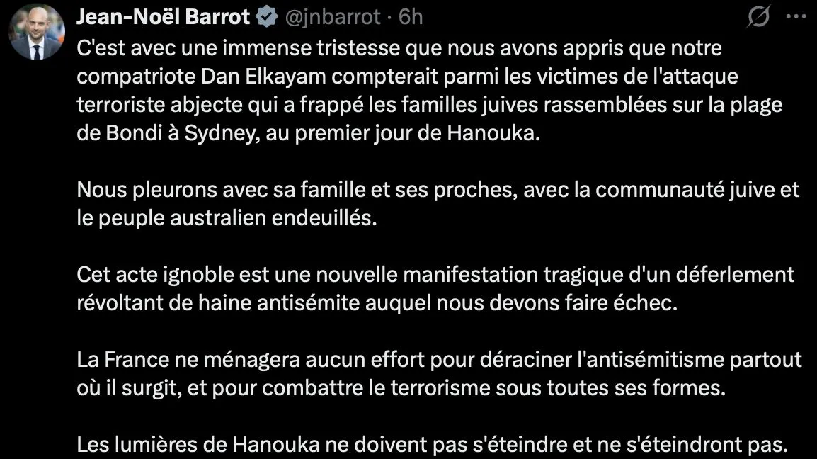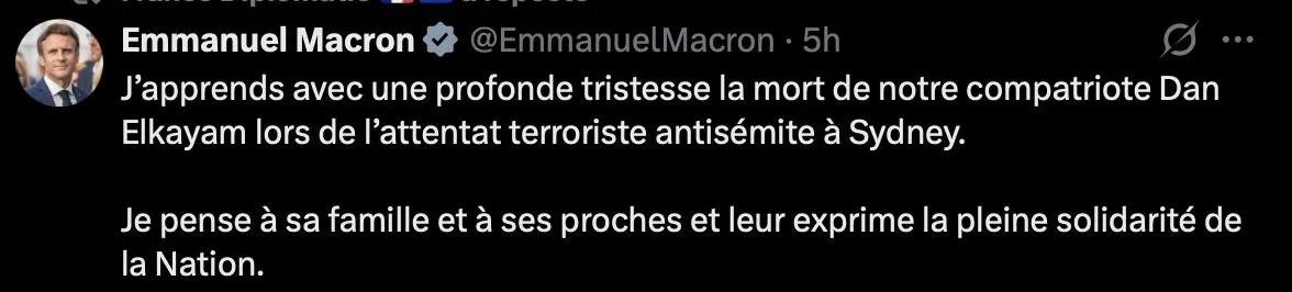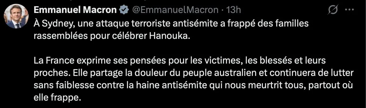 J’adresse nos pensées solidaires aux victimes, à leurs familles ainsi qu’à l’ensemble de la communauté juive d’Australie et d’ailleurs. Je réaffirme également notre attachement indéfectible à la lutte contre toutes les haines, et notre engagement constant en faveur du dialogue, de la tolérance et du respect entre les peuples. »