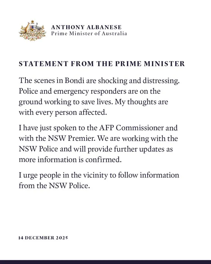 Déclaration de Robert Gregory, directeur général de l’Association juive australienne : « Ce qui s’est passé ce soir est une tragédie, mais parfaitement prévisible. » Le gouvernement albanais a été averti à maintes reprises, mais n’a pas pris les mesures adéquates pour protéger la communauté juive. Ce soir, de nombreux Juifs se demandent s’ils ont un avenir en Australie. Nos pensées vont à notre communauté et à toutes les personnes touchées, dont certaines nous sont proches.