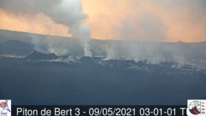 L’éruption débutée le 09/04/2021 à 19h (apparition du trémor) se poursuit. L’amplitude du trémor volcanique (indicateur d’une émission de lave en surface) continue sa lente décroissance initiée depuis le 2 mai (Figure 1). Son amplitude reste cependant encore significative, atteignant