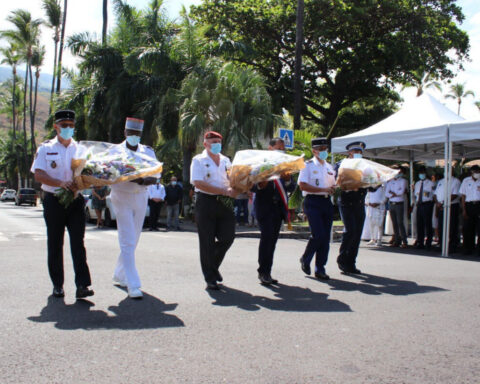 Bruno Domen, Maire de Saint-Leu, aux côtés des élus du Conseil municipal, de Jean-Pierre Cadiergues le Président de l’association des anciens combattants de Saint-Leu, du Lieutenant-colonel Ambroise PermalnaÏck, représentant des Forces Armées dans la Zone Sud de l’Océan Indien, du