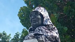 À la ravine Blanche à St-Pierre, la statue de Gandhi a été habillée. Peut-être pour la protéger du soleil, ou des fortes pluies? Vos réactions au 0262 41 51 51. Crédit photo: reçues par mail à web@freedom.fr