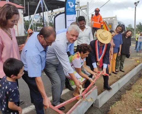 Aujourd’hui a eu lieu la pose de la première bordure des travaux d’aménagement de la Route Départementale 27, plus connue sous le nom de la Route de Bras de Pontho, en présence du Maire du Tampon, André Thien Ah Koon, de