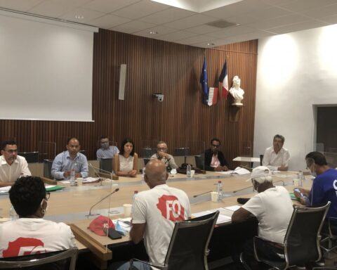 Emmanuel Séraphin, président du TCO et maire de Saint-Paul, Vanessa Miranville, maire de La Possession, Olivier Hoarau, maire du Port, Daniel Pausé, maire de Trois-Bassins et Bruno Domen, maire de St-Leu, se sont longuement entretenus, cet après-midi avec l’Intersyndicale Transports,