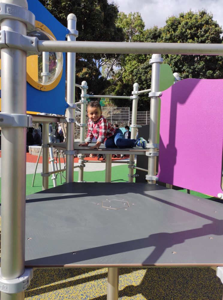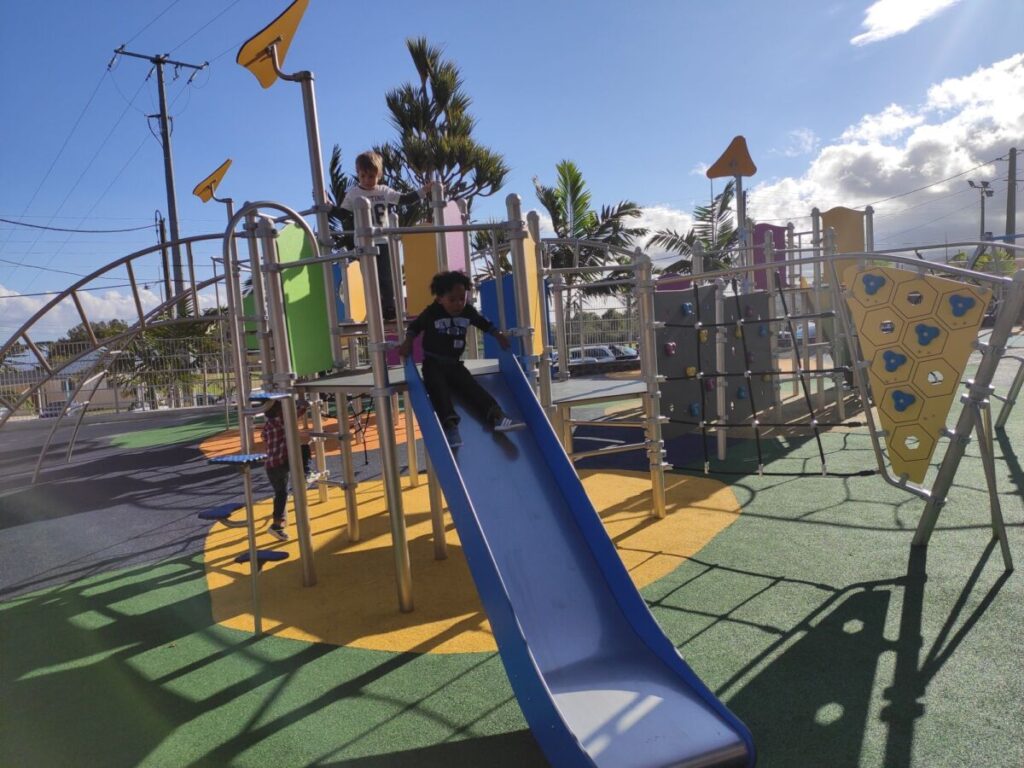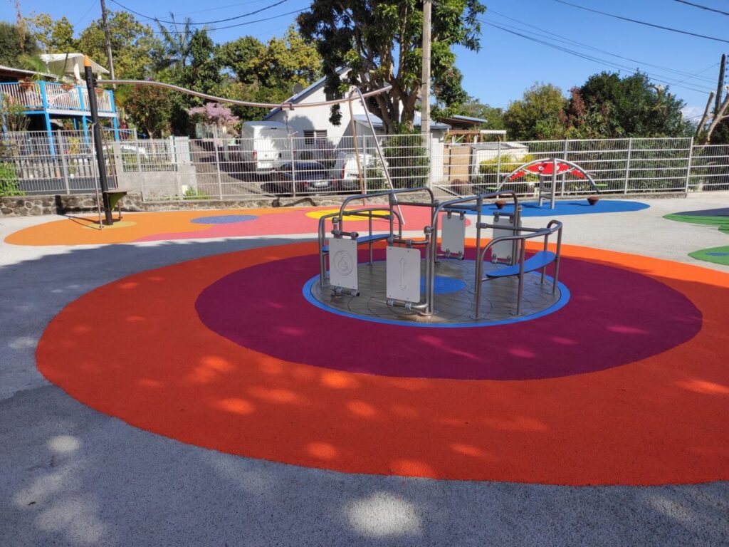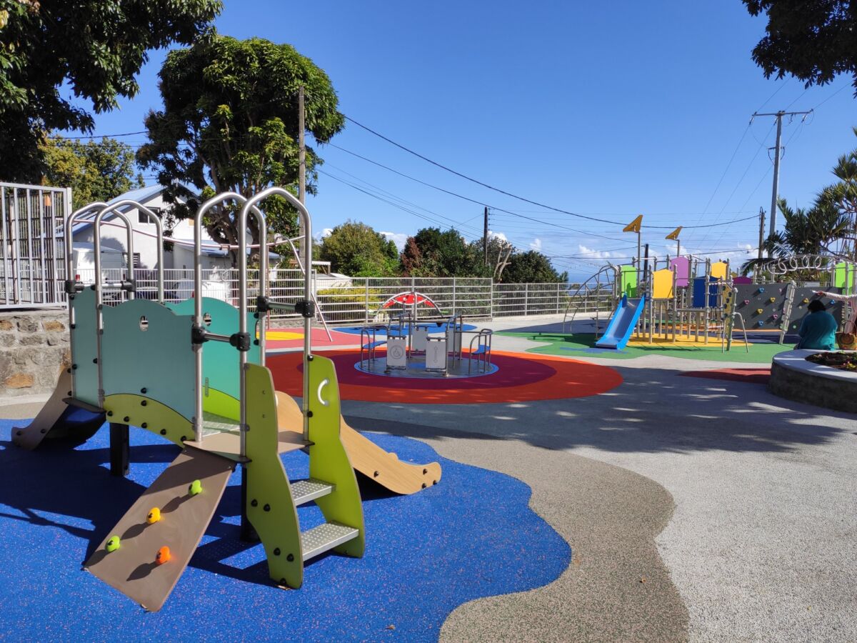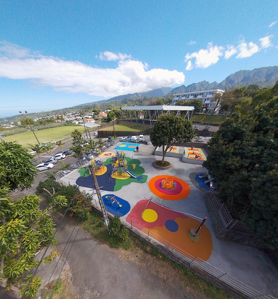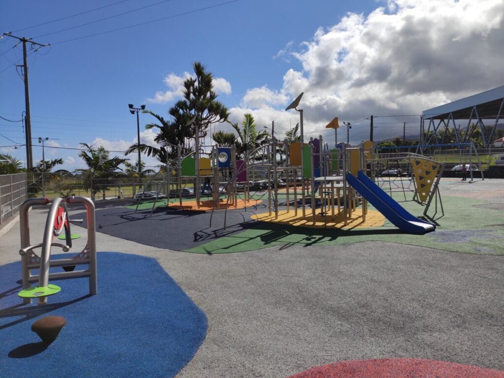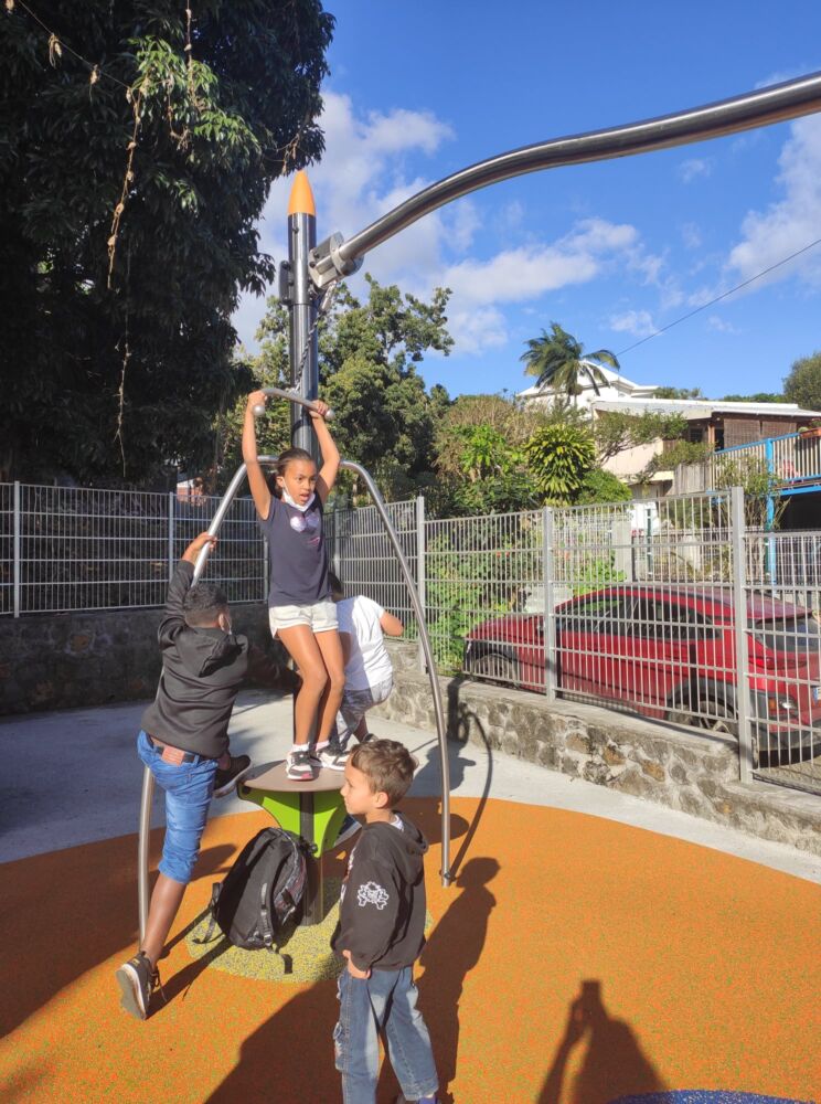 Cet aménagement ludique situé à proximité de l’école Primaire de Bras de Pontho a conquis parents et enfants qui se sont appropriés ce terrain de jeux dès son ouverture.