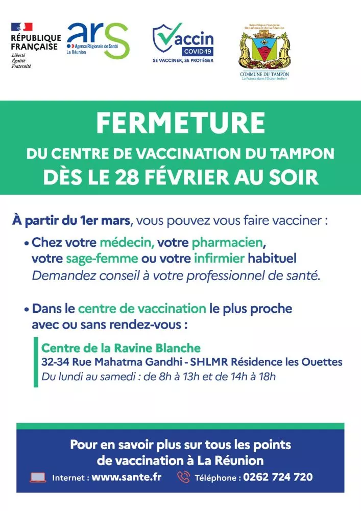 Les prises de rendez-vous étant moins nombreuses, le centre de vaccinaton contre la Covid-19 du Tampon (salle Raymond Lauret) fermera ses portes ce soir.