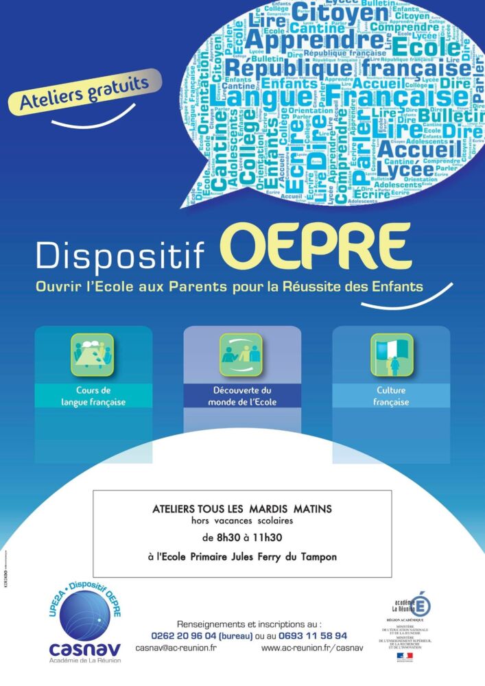 Le mardi 14 septembre de 8h30 à 11h30 l’atelier OEPRE (Ouvrir l’Ecole aux Parents pour la Réussite des Enfants) reprendra à l’école Primaire Jules Ferry.