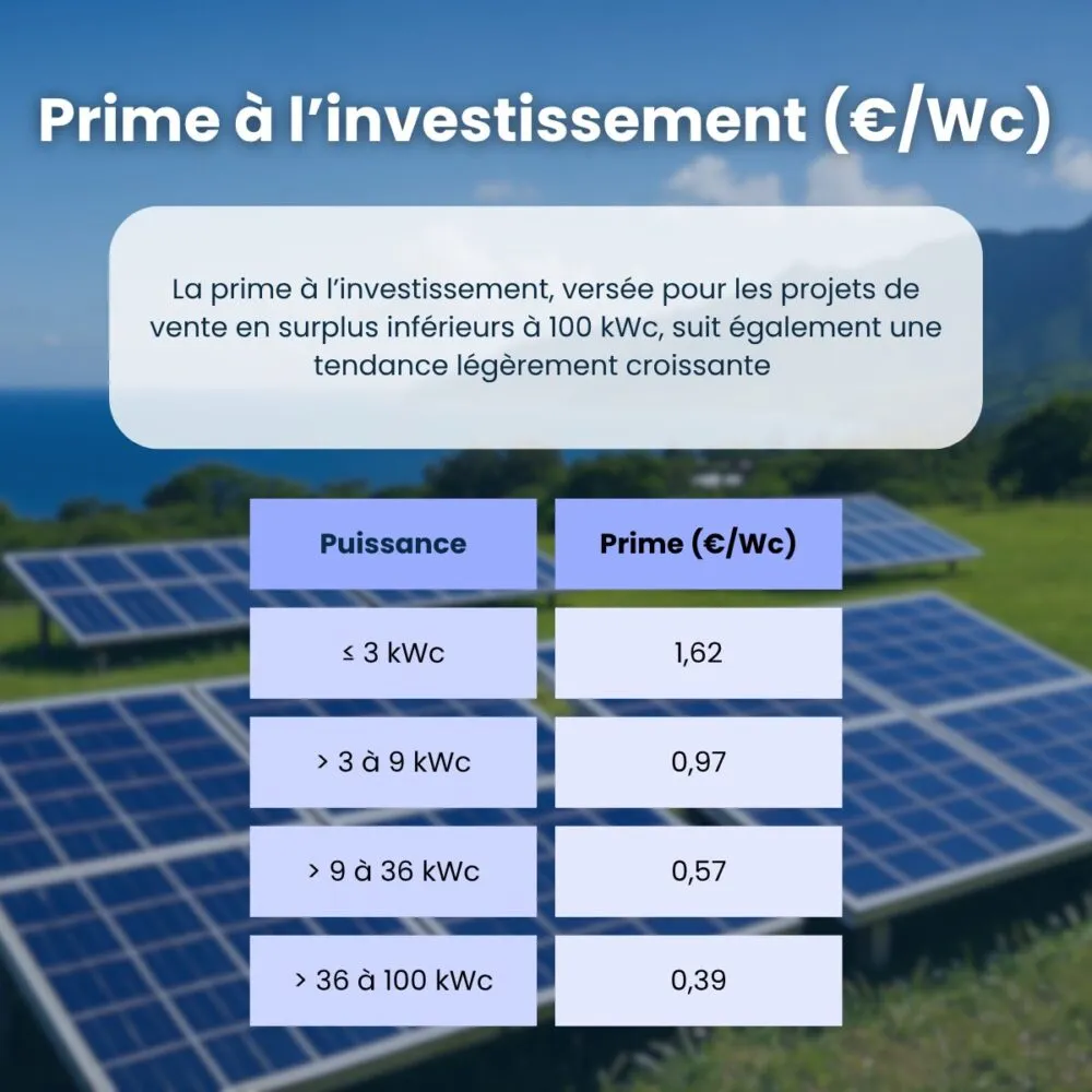 On note sur le trimestre T6 2025 une légère augmentation des tarifs de revente, tant pour la vente totale que pour la vente en surplus, ainsi qu’une hausse des primes d’investissement.