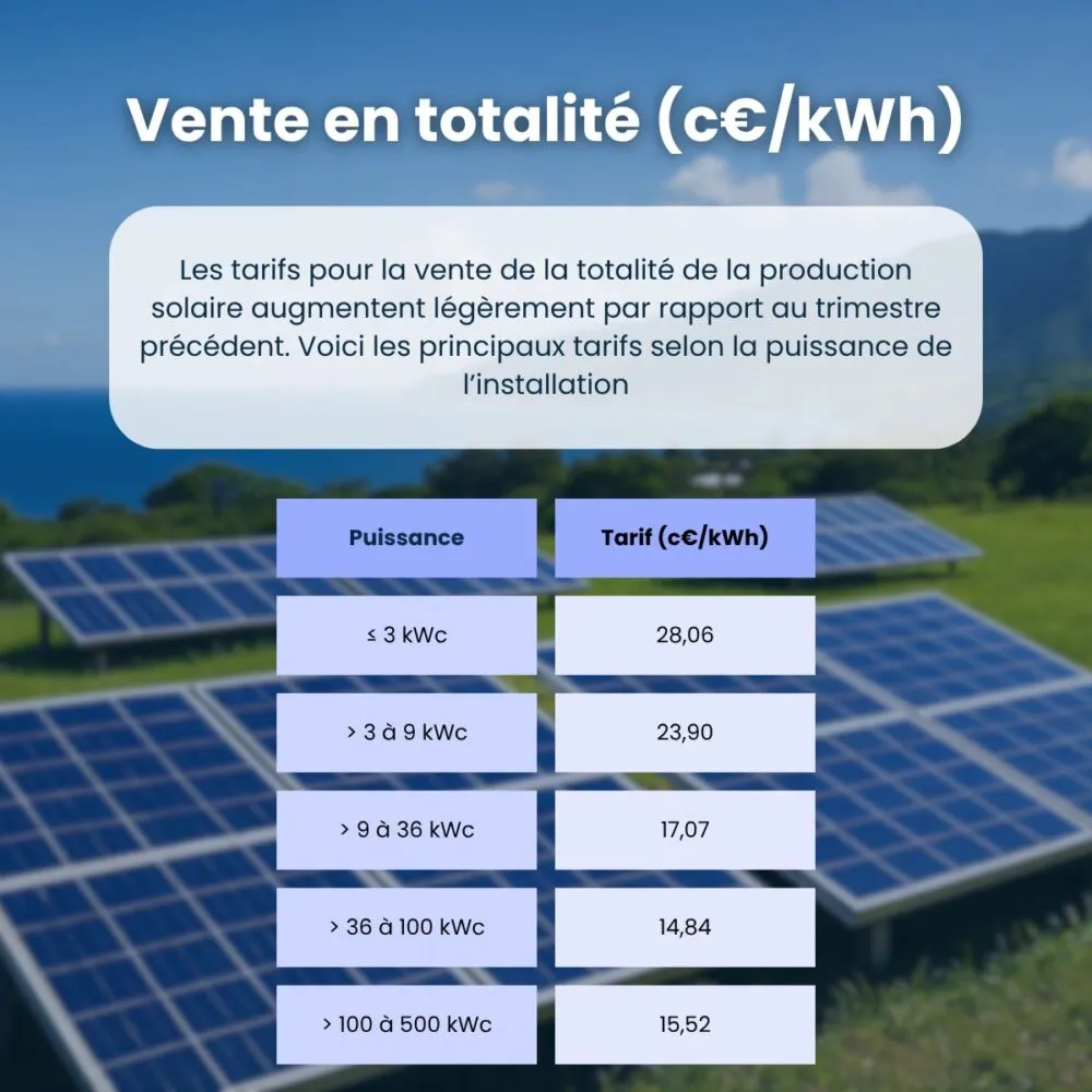 La Commission de Régulation de l’Énergie (CRE) a publié les tarifs d’achat de l’électricité photovoltaïque pour les zones non interconnectées (ZNI), dont La Réunion, pour le 6e trimestre tarifaire de la période S24 (du 1er août au 31 octobre 2025). Ces tarifs sont applicables aux installations dont la demande complète de raccordement a été effectuée durant ce trimestre.