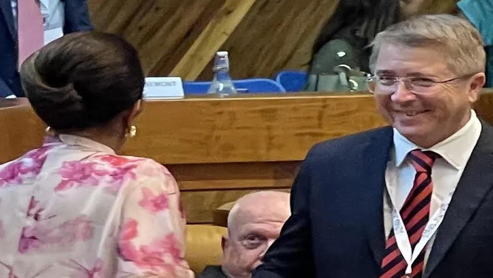 Mario Lechat (à droite) salue, tout sourire, le député européen de La France Insoumise Younous Omarjee.
