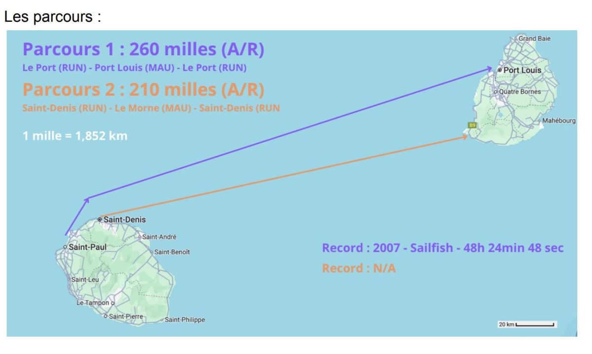 La ligne de départ serait au Barachois de Saint-Denis, le point de passage serait au Morne à l’Île Maurice, puis se terminerait par la traversée retour jusqu’au Barachois. Ce parcours, plus court, présente plusieurs avantages :