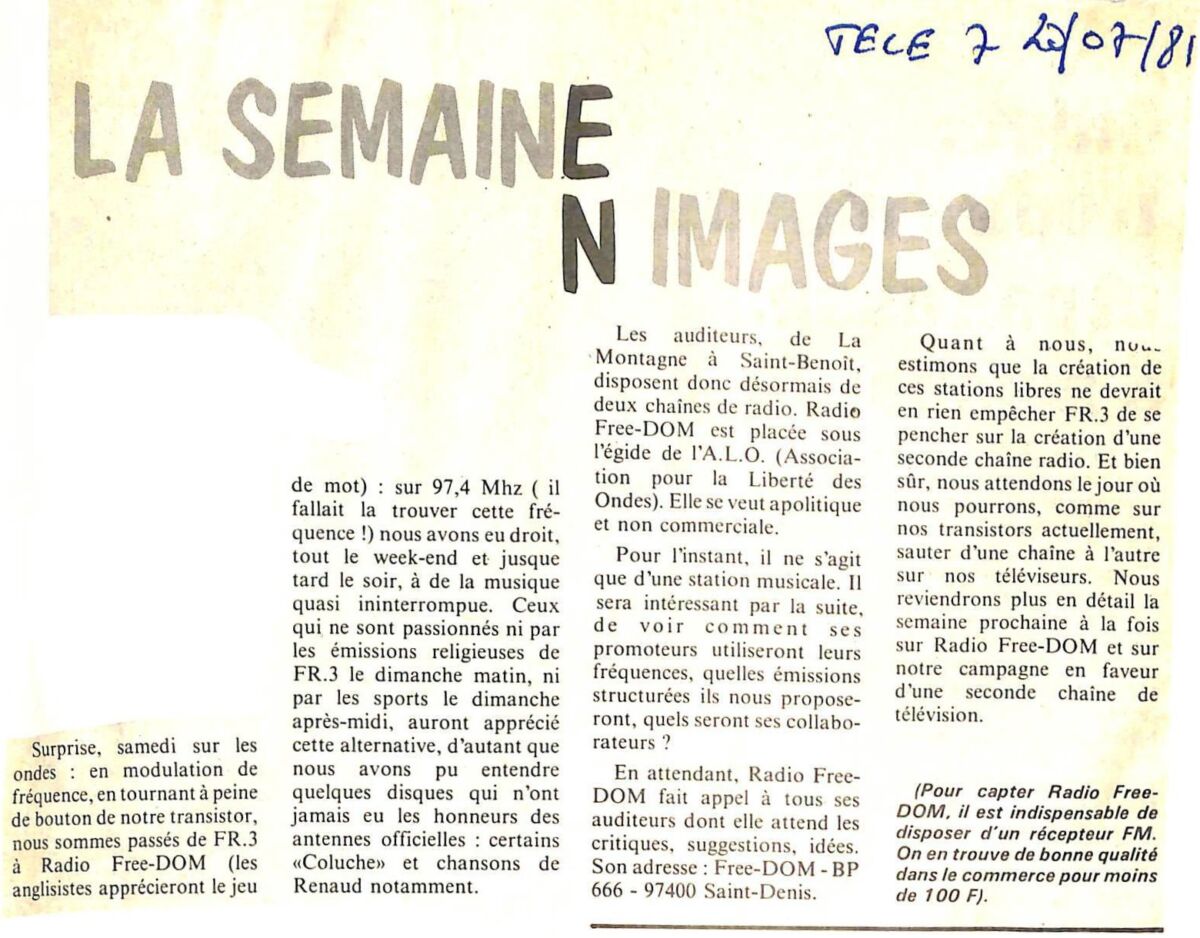 1981 Télé 7 nous rappelle qu’à l’époque il n’y avait qu’une seule chaîne de télévision ! par La Rédaction 20 juillet 1981 1 min de lecture Déjà, l’adresse de Free Dom était communiquée à l’antenne. Elle n’a pas changé depuis ! (BP 666 97400 Saint-Denis) Ne manquez pas toute l’actualité de La Réunion ! Abonnez-vous à la newsletter de Free Dom ! Valider Partager Facebook Twitter Pinterest Linkedin Whatsapp Reddit Email Vous pourriez être intéressé par 14 janvier 2023 69 migrants sri lankais sont arrivés au Port à 4h30 23 décembre 1981 Lettre ouverte à un commentateur de Radio Free Dom 1 décembre 1981 Radios libres : Noël Caro s’indigne La Rédaction Laisser un commentaire Annuler la réponseYour email address will not be published. Enregistrer mon nom, mon e-mail et mon site dans le navigateur pour mon prochain commentaire. Current ye@r * Leave this field empty Article précédent Première conférence de presse de radio Free Dom Article suivant Le journaliste Ian Hamel raconte l’histoire de la naissance de Radio Free Dom Articles récents... Hommage à Johnny Hallyday sur Free Dom 2 ce 5 décembre Mardi 30 décembre 2025 – Météo, éphéméride et horoscope du jour Saint-Joseph : découverte de 2337 plants de cannabis, arrestation de 2 individus Point sur le réseau routier départemental, 29 décembre à 16H30 Suicide sur le pont de la Rivière d’Abord : importante mobilisation des secours et des forces de l’ordre Radier submergé à Ilet Furcy : la route de Cilaos fermée à la circulation cette nuit Fortes pluies : appel à la plus grande prudence à Saint-Paul Saint-Gilles-les-Bains : une route impraticable, les riverains montent au créneau (VIDEOS) Très grands excès de vitesse : un délit passible de prison depuis le 29 décembre 2025 Fermeture temporaire du sentier de la Canalisation des Orangers (cirque de Mafate)