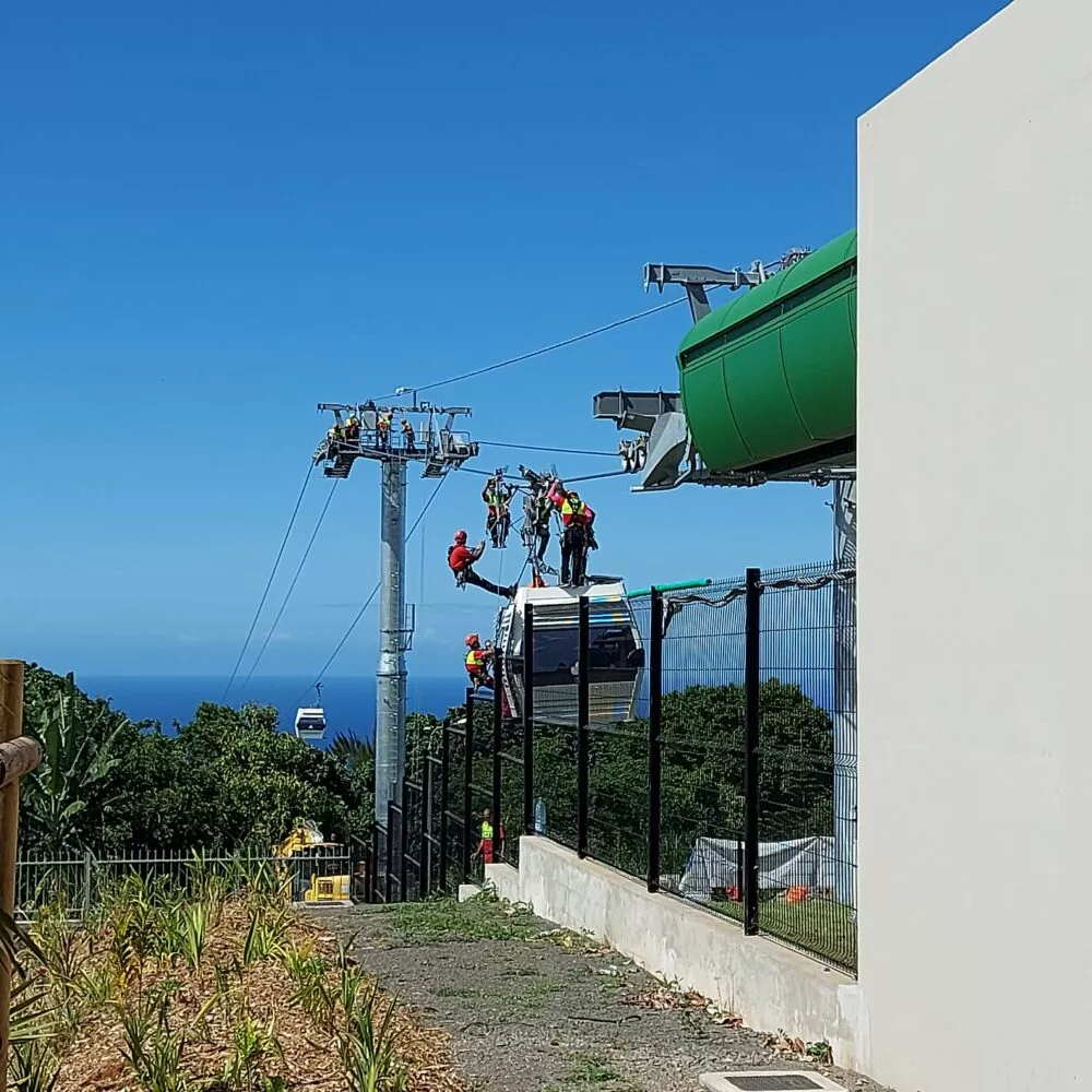 Tous les « voltigeurs » de La Réunion sont à la tâche cette semaine. Quiconque lève les yeux ne peut rater la présence des équipes du SDIS (Service Départemental d’Incendie et de Secours) dont le GRIMP (Groupe de reconnaissance et d’intervention en en milieu périlleux), du PGHM (Peloton de Gendarmerie de Haute Montagne) et duRAID (Recherche, Assistance, Intervention, Dissuasion) sur les pylônes et le câble.
